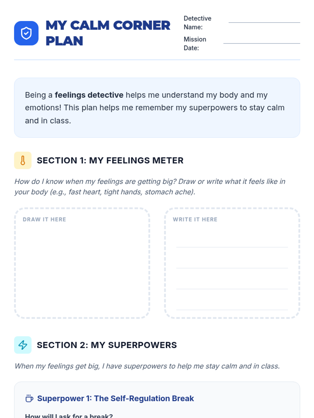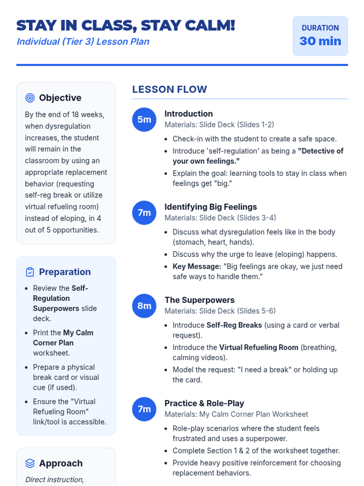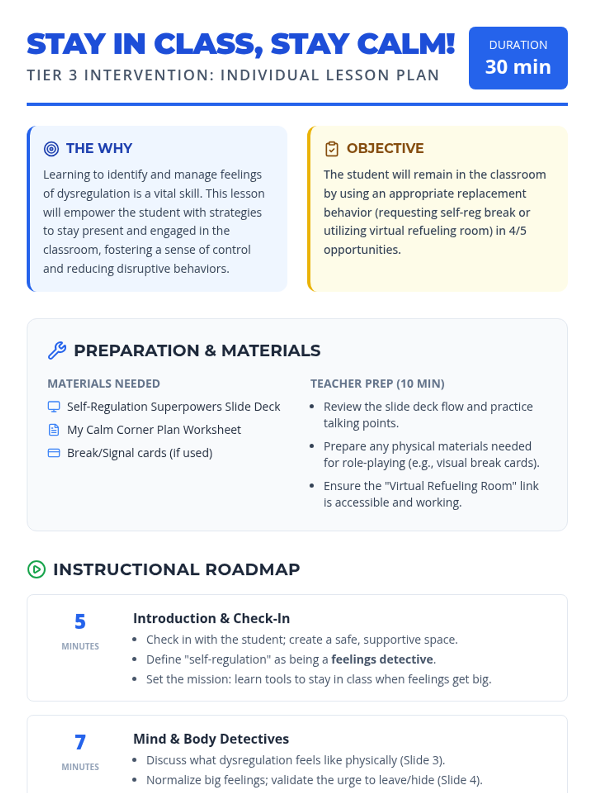 A Tier 3 individual lesson focused on teaching self-regulation strategies (requesting breaks and virtual refueling) to manage dysregulation and reduce elopement. This lesson uses a superhero/detective theme to empower students to stay in the classroom.