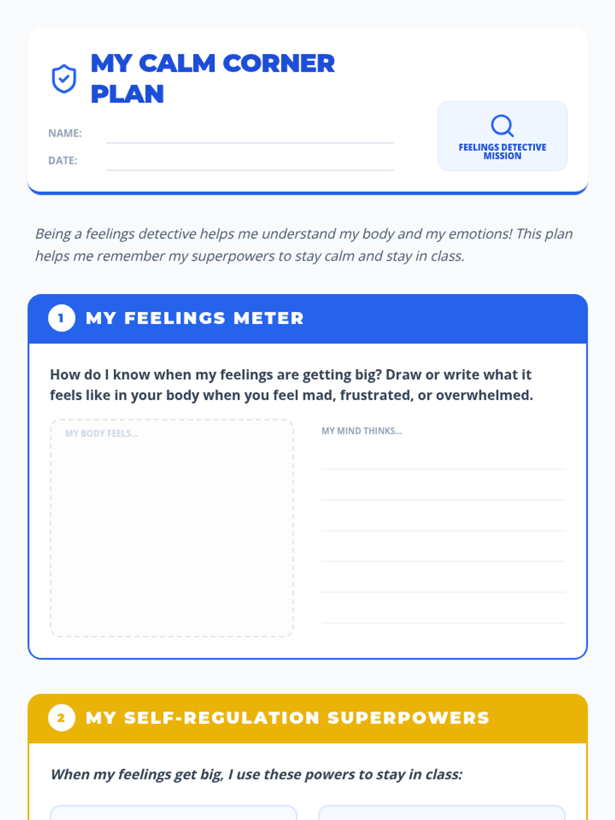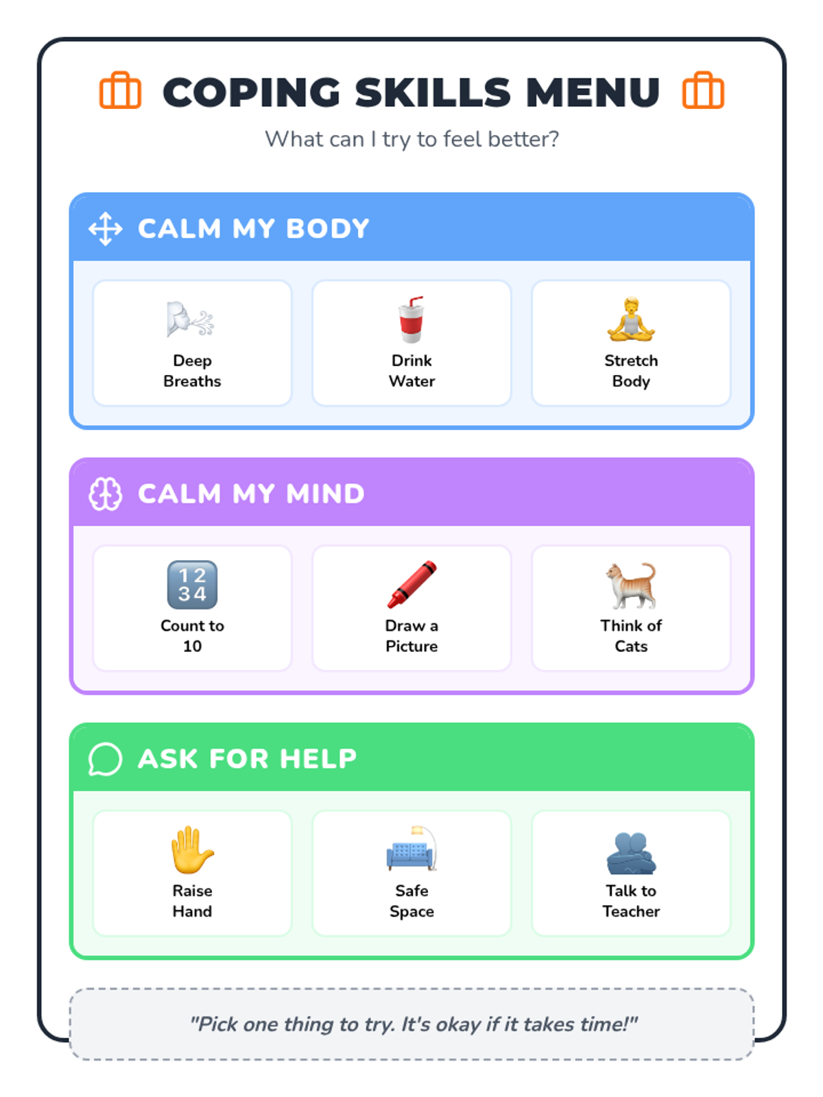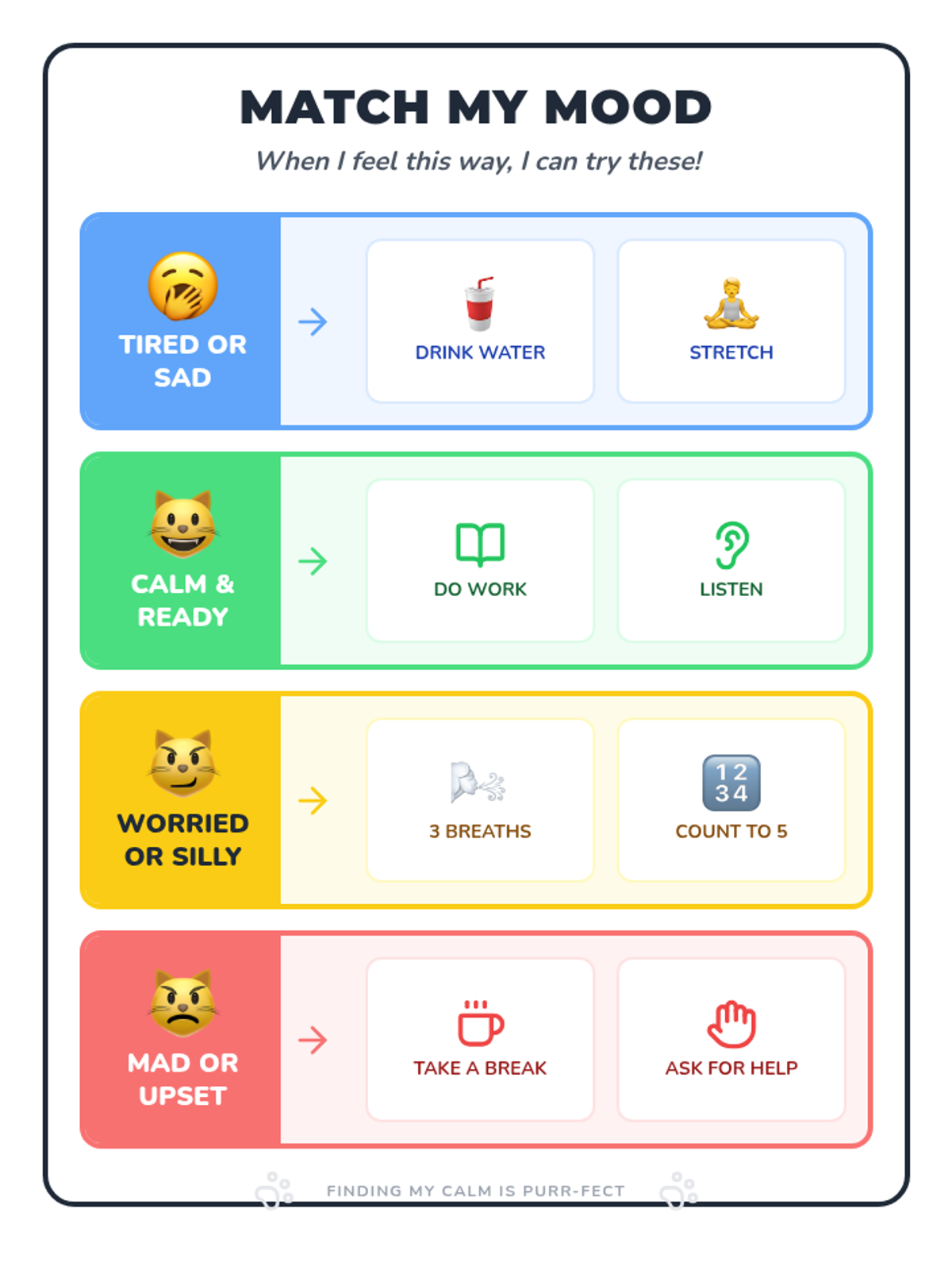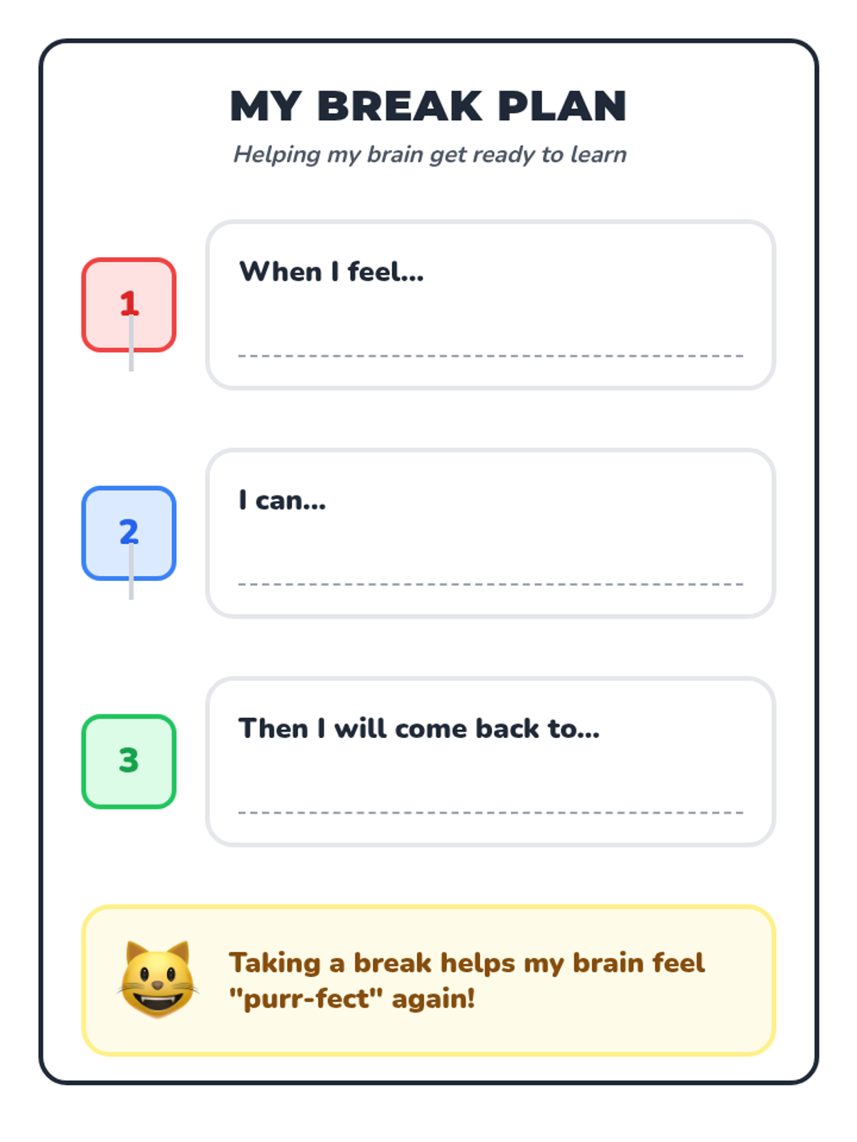 A comprehensive binder of emotional regulation and coping tools for a 2nd-grade student. Featuring a friendly cat theme, these visual-heavy resources support feelings identification, break-taking, problem-solving, and classroom engagement with minimal reading required.