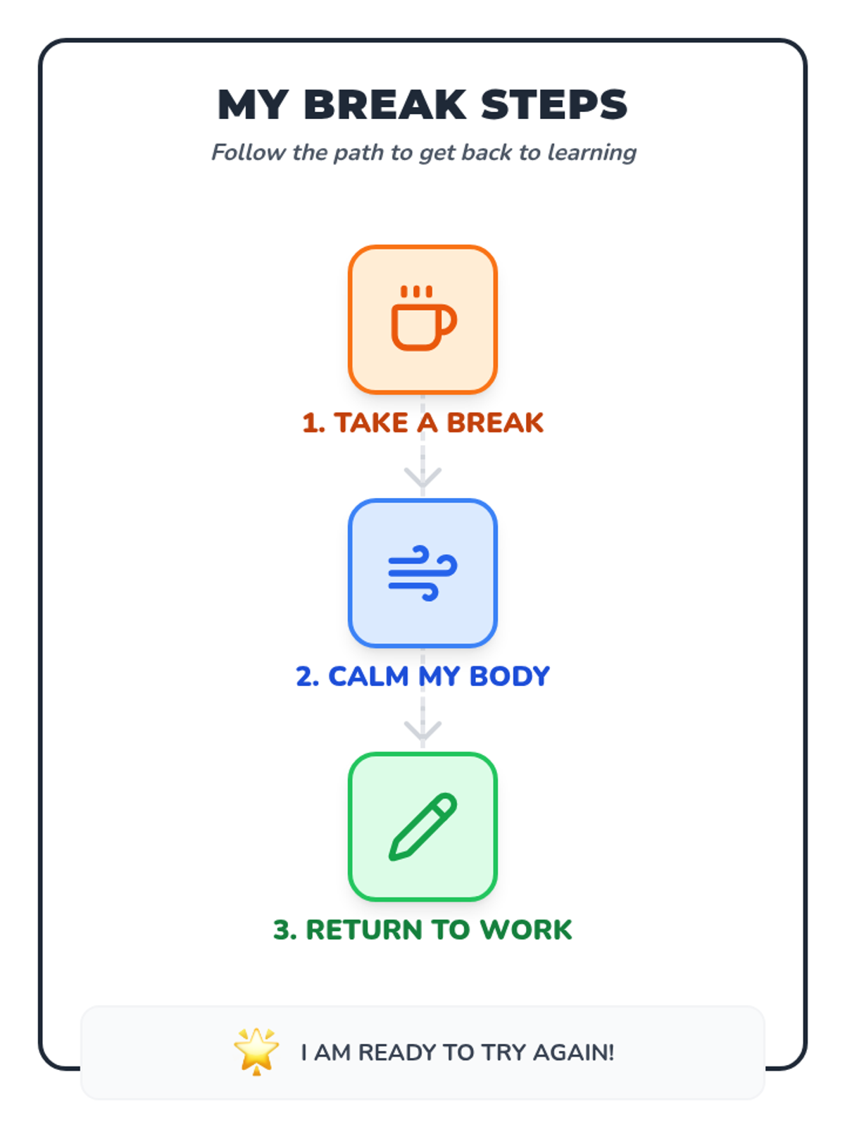 Students practice self-regulation techniques like deep breathing and counting to 'pause' before reacting to a trigger, helping them maintain positive behavior tracking.