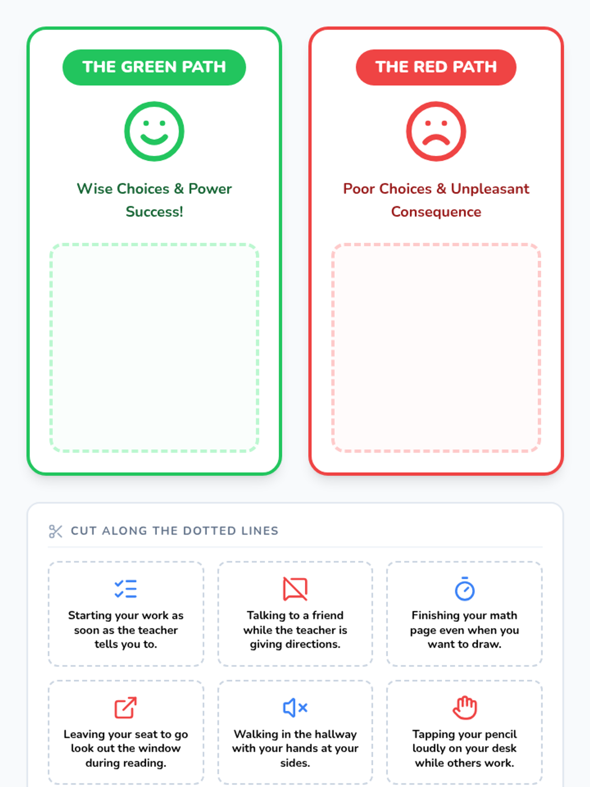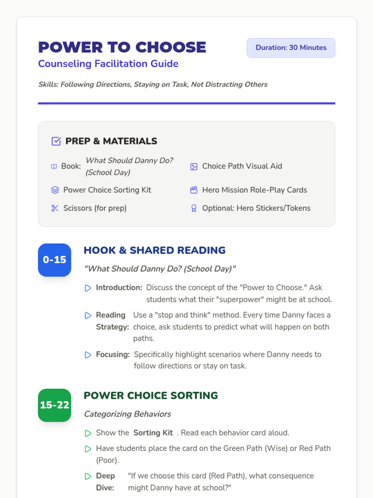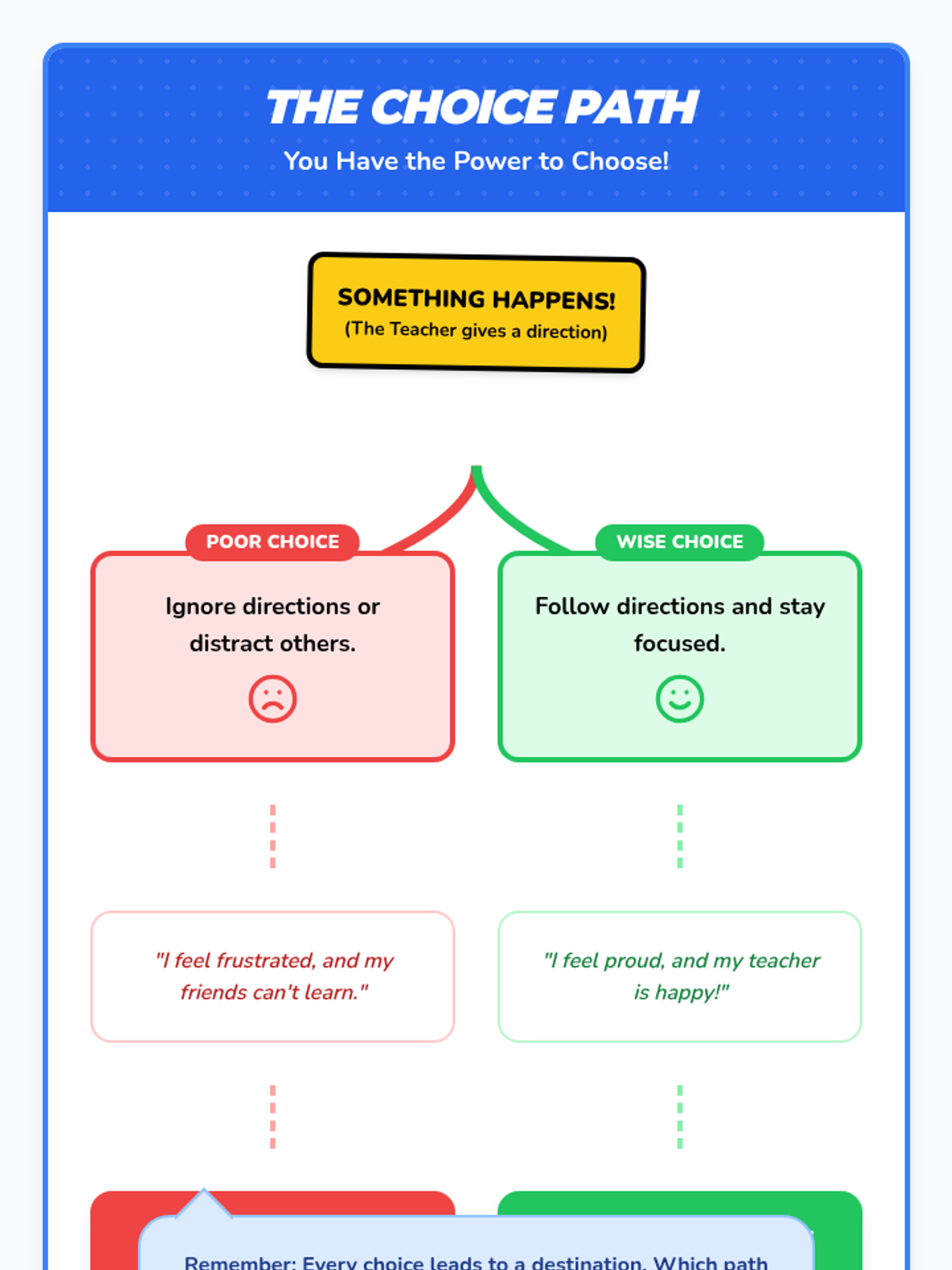 A social-emotional learning lesson for 1st and 2nd graders focused on the 'Power to Choose' through the lens of school behaviors like following directions and staying on task. Includes a decision tree visual, a dice game for verbal expression, and a cooperative board game.