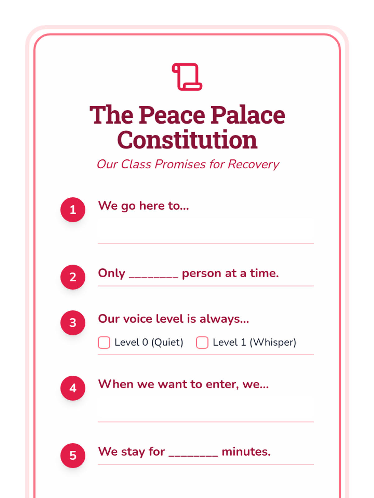 Students collaborate to create a 'Constitution' for the recovery space, establishing rules for entry, privacy, and duration to ensure it remains a place for healing.
