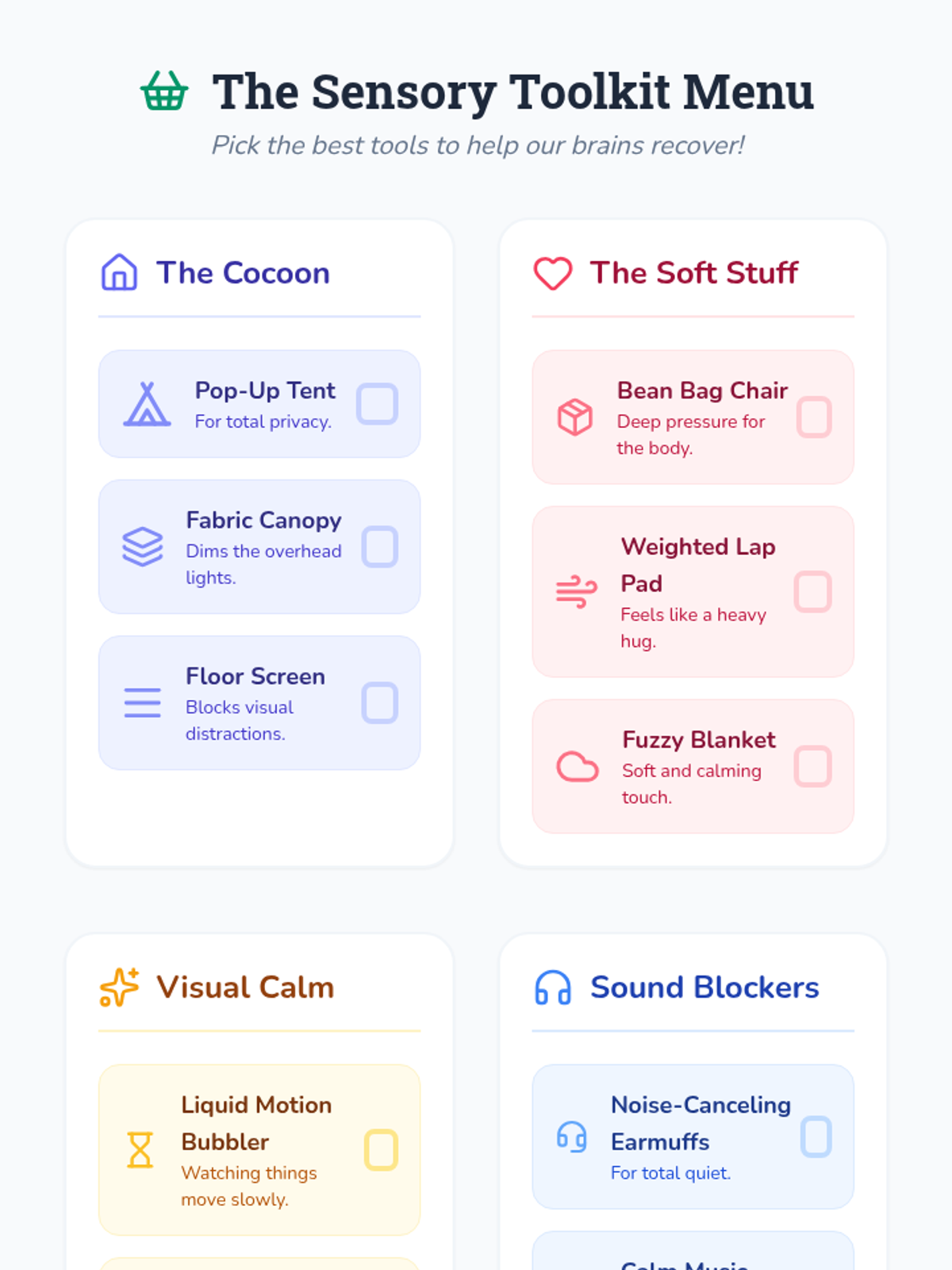 Students conduct a hands-on audit of their classroom to identify environmental sensory triggers and discuss how these factors impact their ability to focus and stay calm.