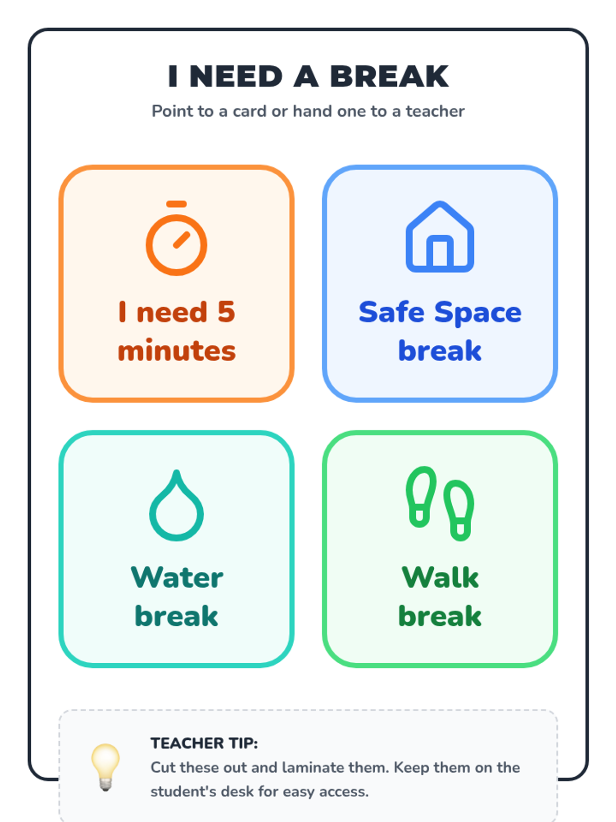 Students create and practice non-verbal signals to request help or space when words are too difficult to use during dysregulation.