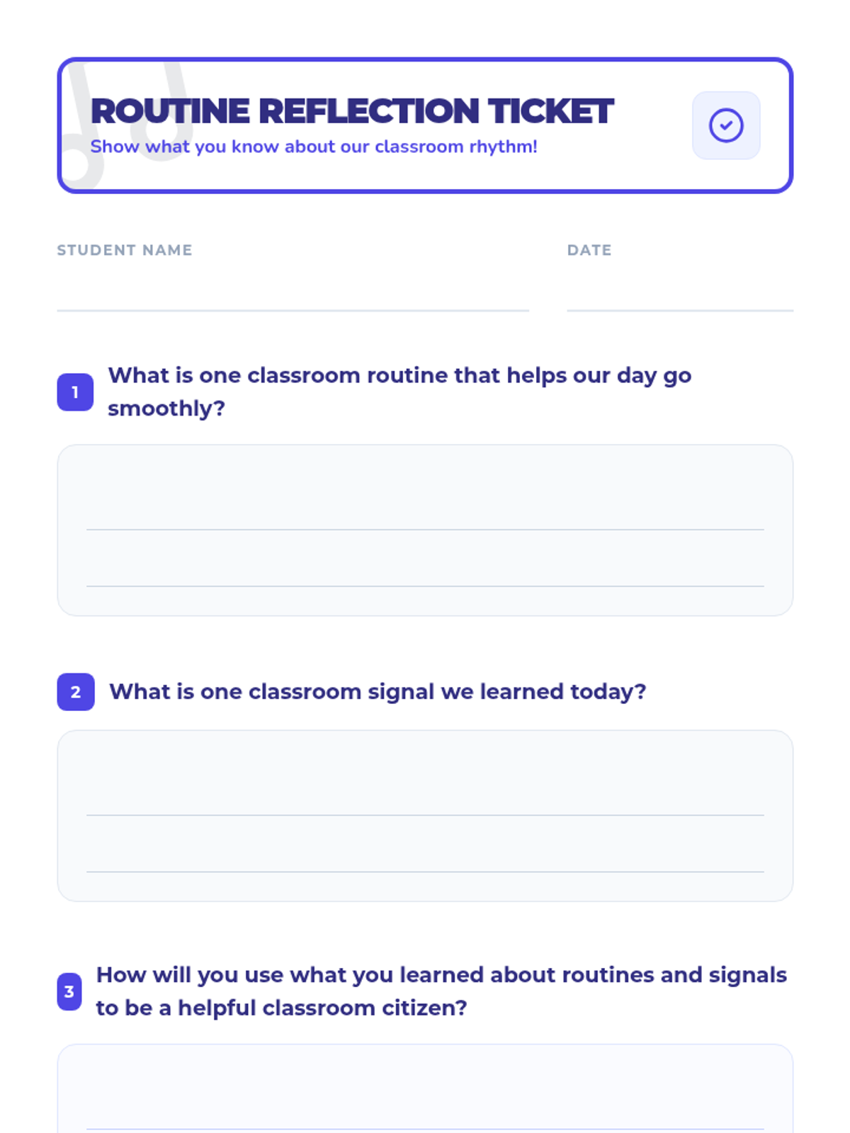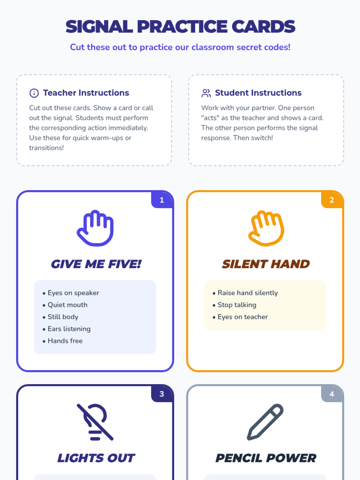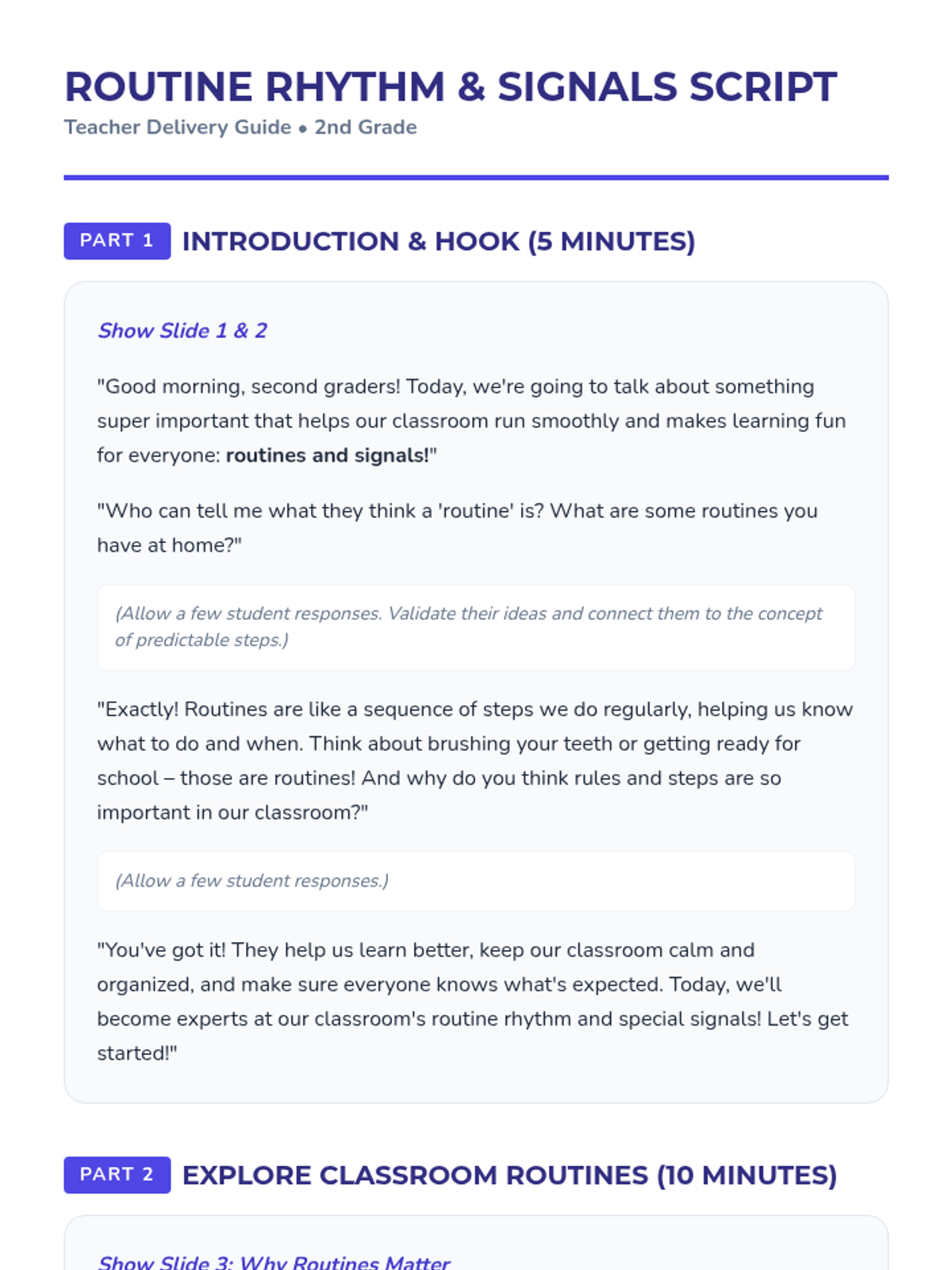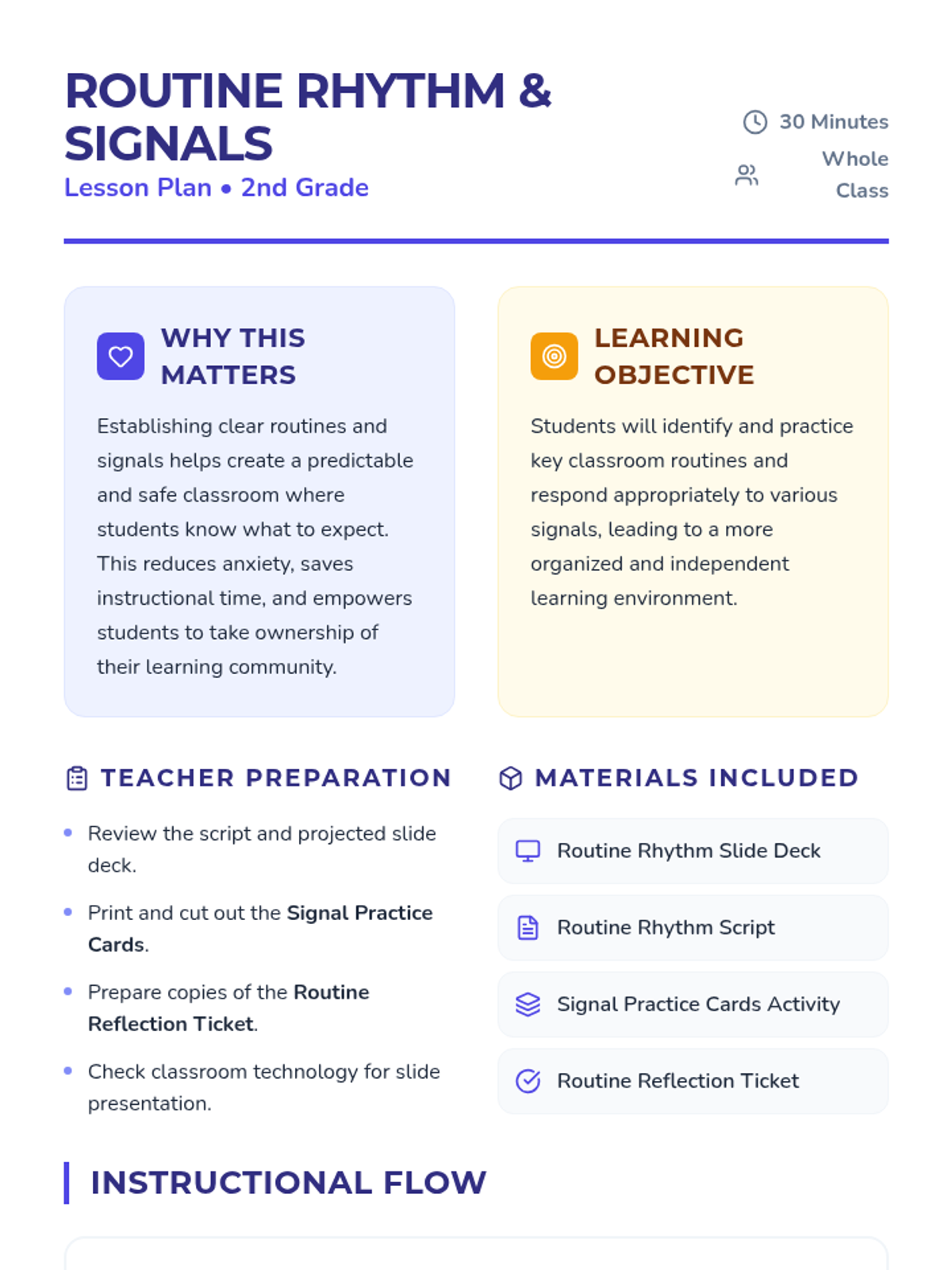 This lesson introduces 2nd-grade students to essential classroom routines and signals, fostering a predictable and positive learning environment. Students will practice key signals and discuss the importance of established routines.