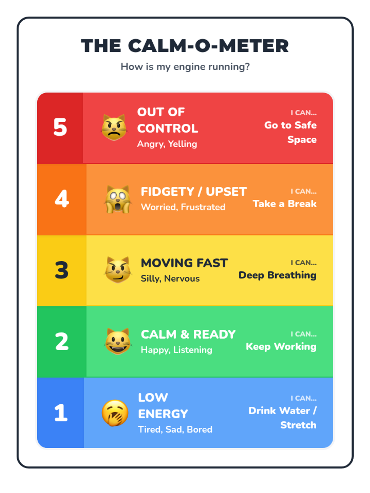 Students will identify and practice specific sensory, physical, and cognitive tools to manage their energy levels and return to the Green Zone.