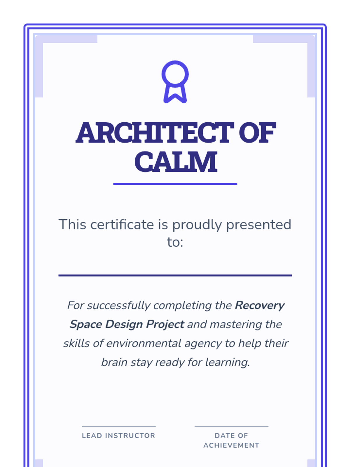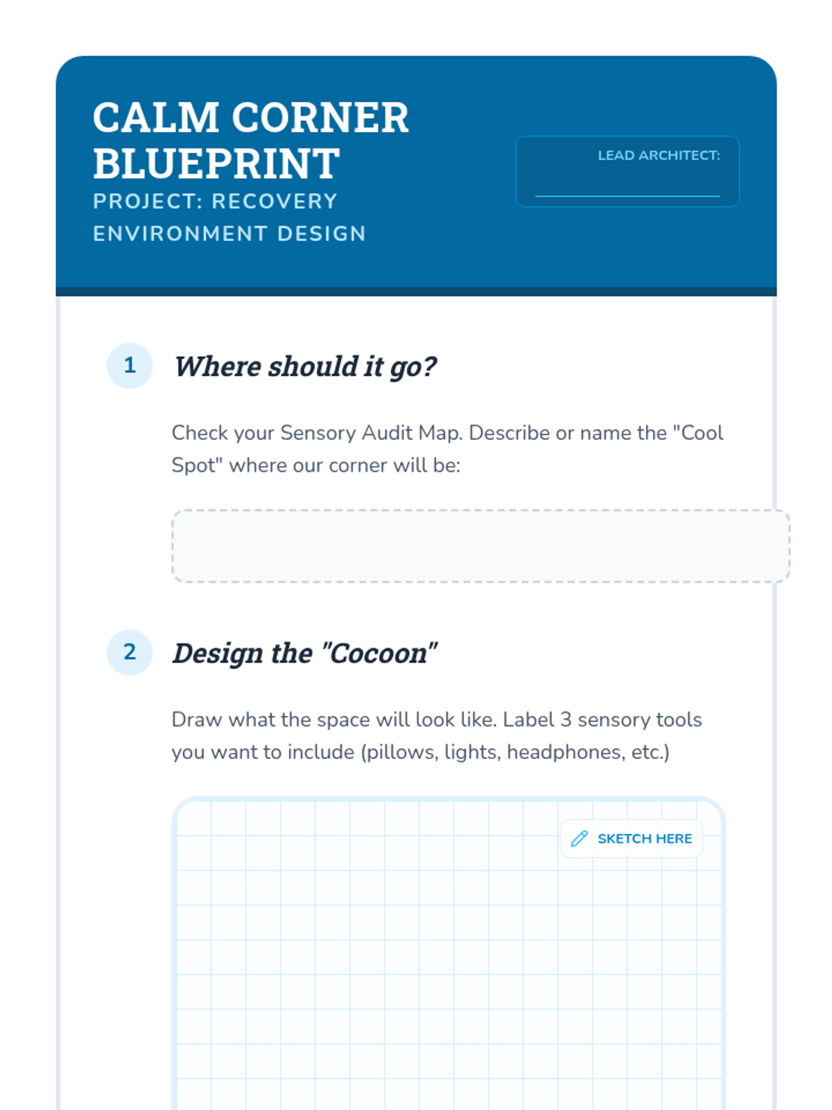 Working in groups, students design the physical layout and contents of an ideal Calm Corner, focusing on sensory needs like enclosures and soft textures.