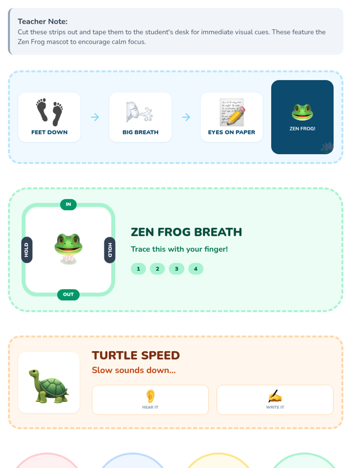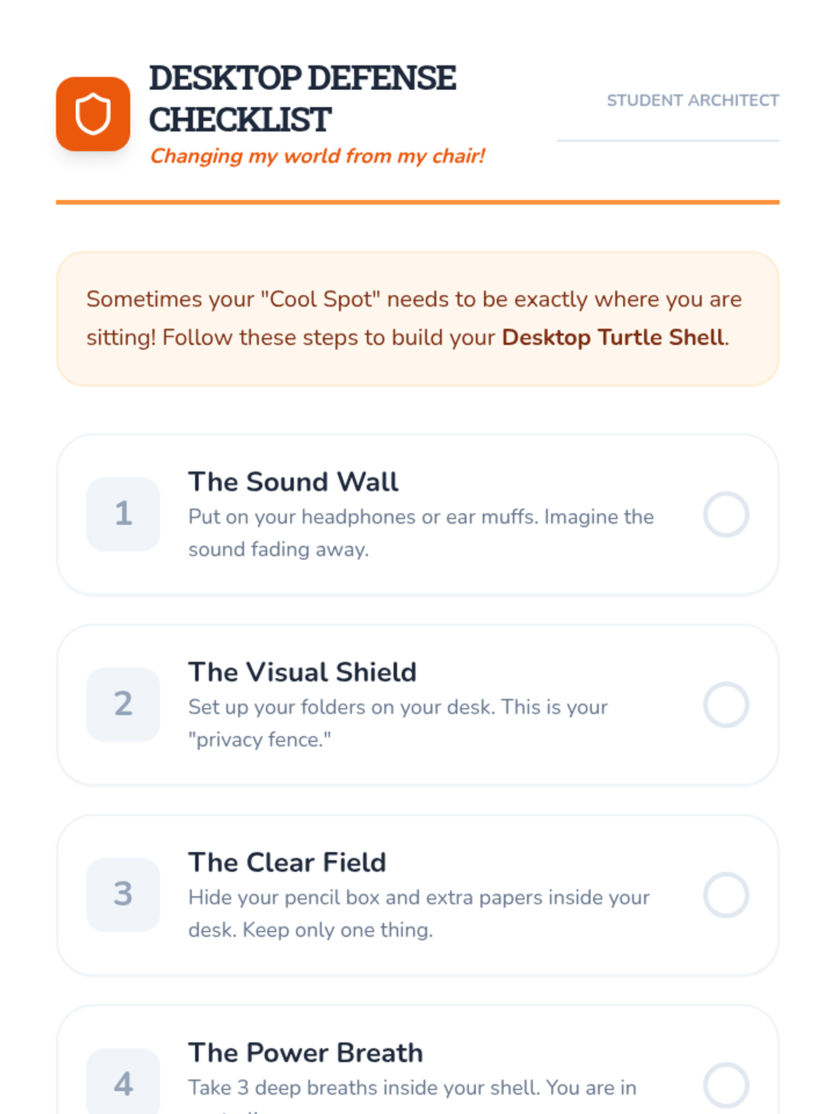 Students learn and practice 'Turtle Shell' skills—modifying their immediate desk environment using noise-canceling headphones, folders, or visual shields.
