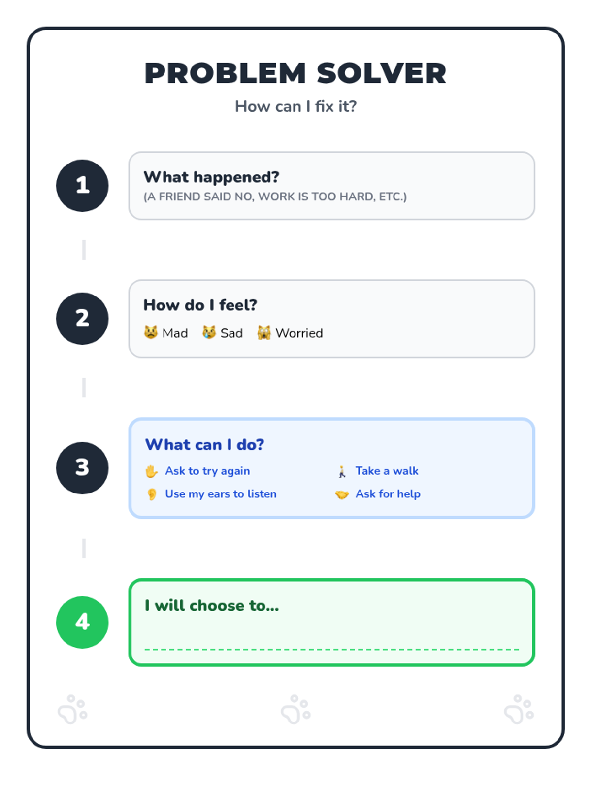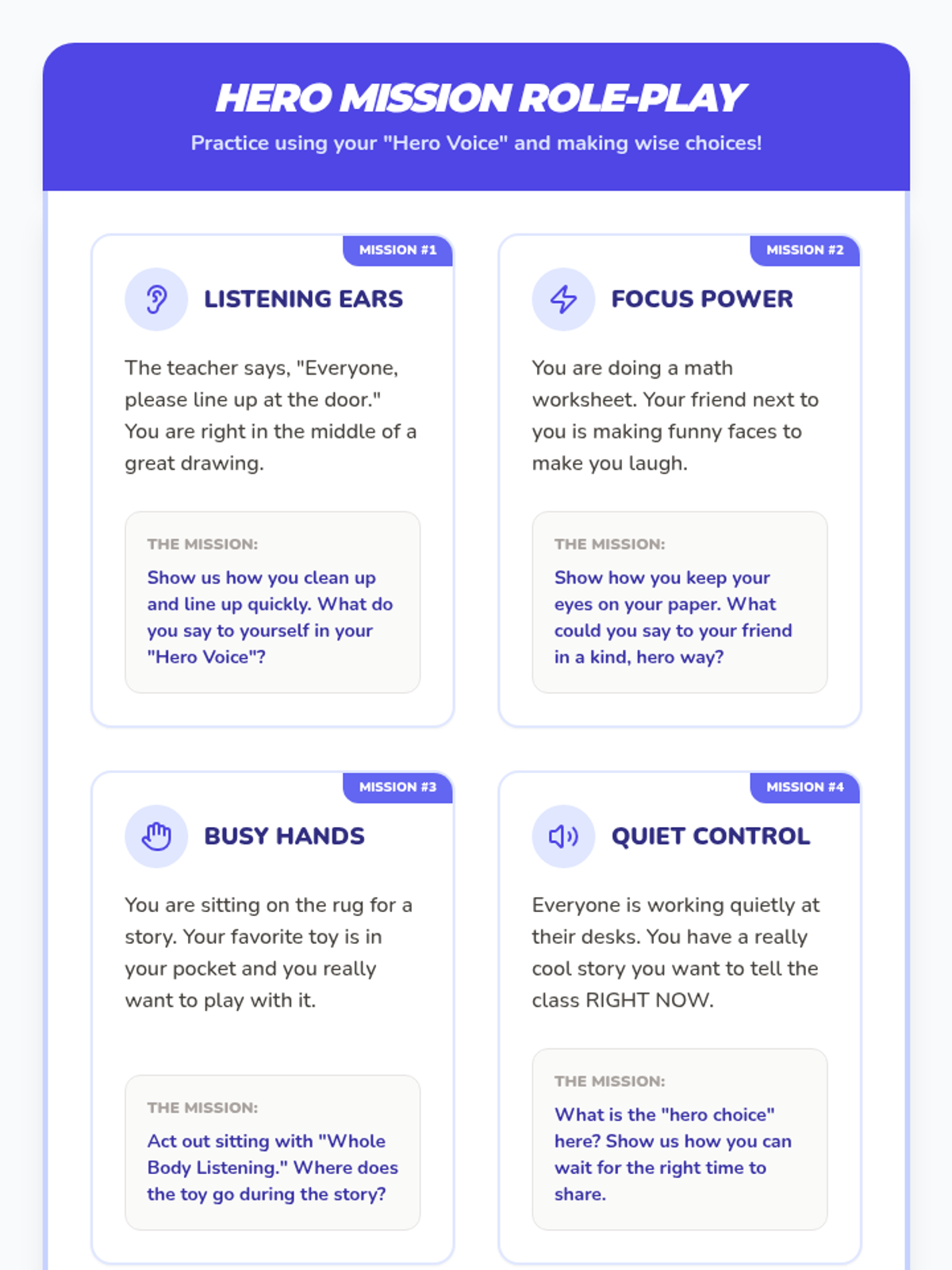 A lesson designed to help students distinguish between Small and Big Problems and choose safe regulation strategies instead of physical reactions. It includes a social story, practice worksheet, and strategy reference guide.