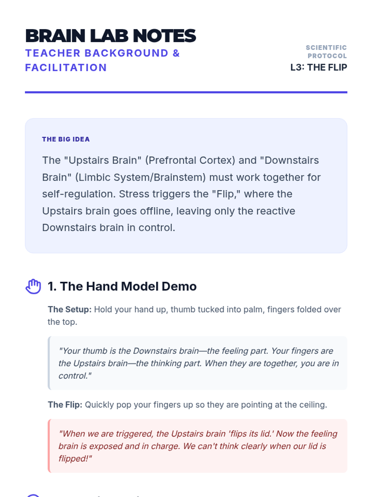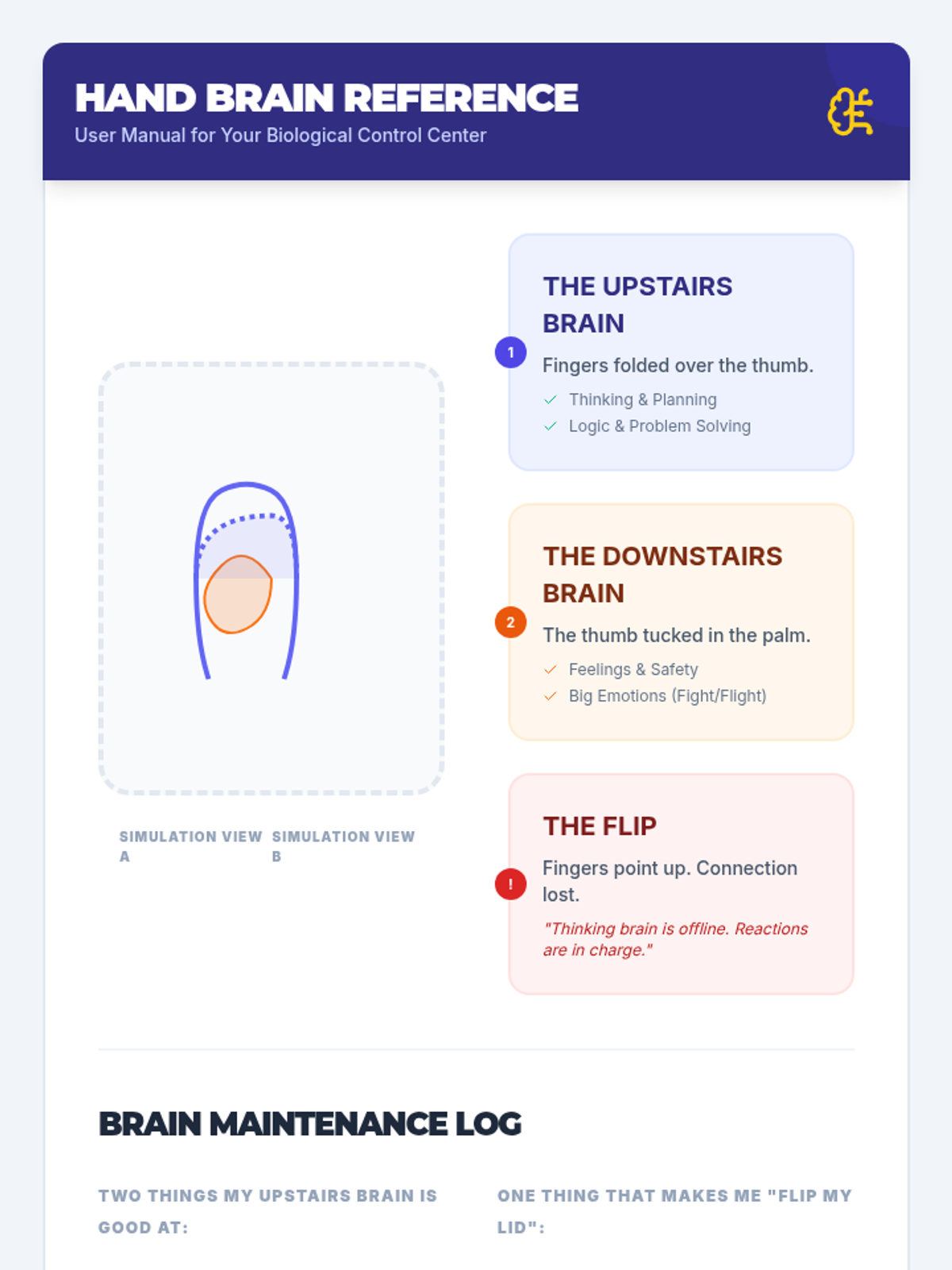 Students learn about the 'upstairs' and 'downstairs' brain to understand the biological basis of emotional dysregulation and the importance of early recognition.