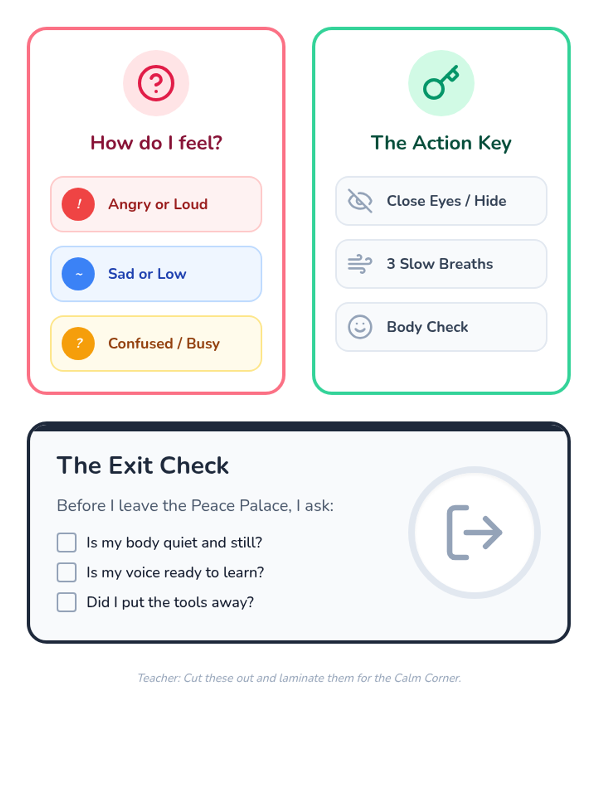 Explicit instruction and role-play on how to use the classroom Calm Corner effectively for regulation.