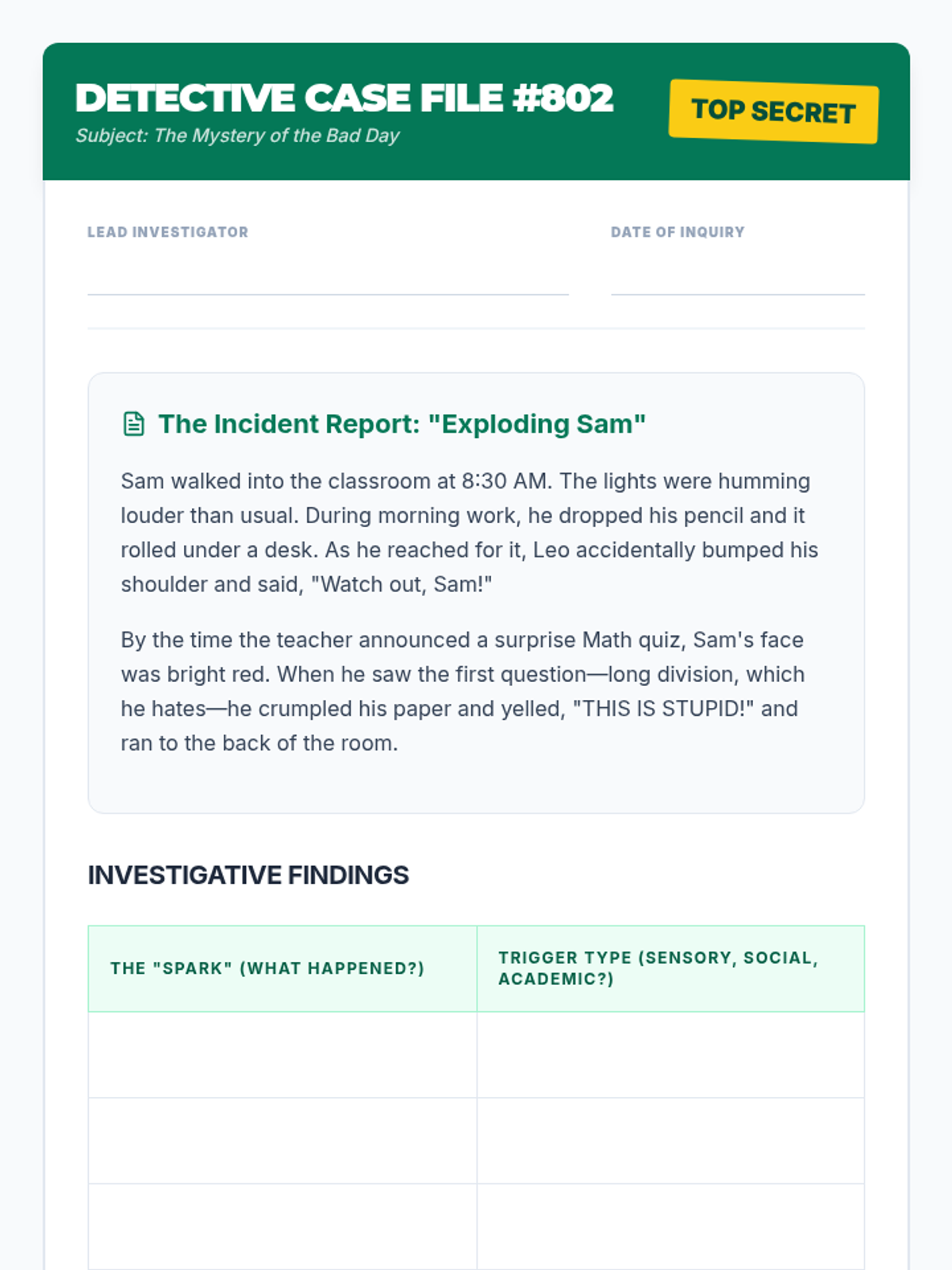 Students analyze fictional behavior logs to identify repeating patterns and specific triggers, learning to brainstorm preventative strategies for challenging times of the day.
