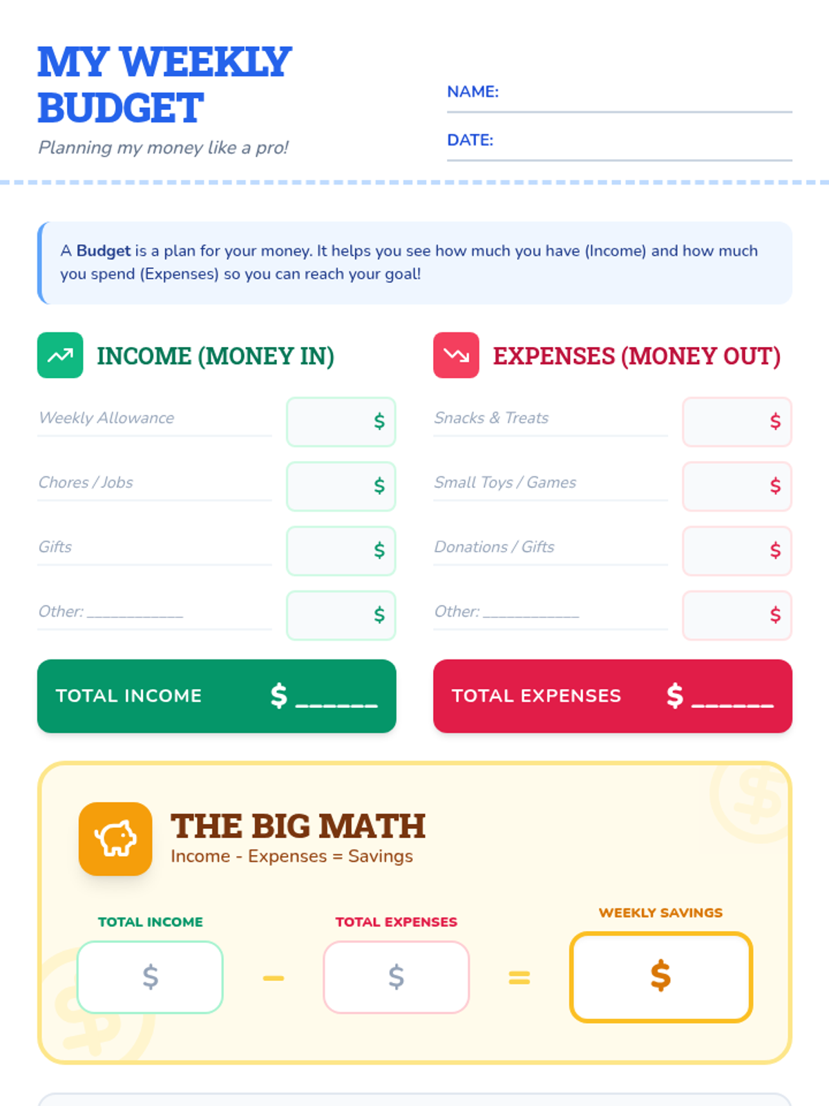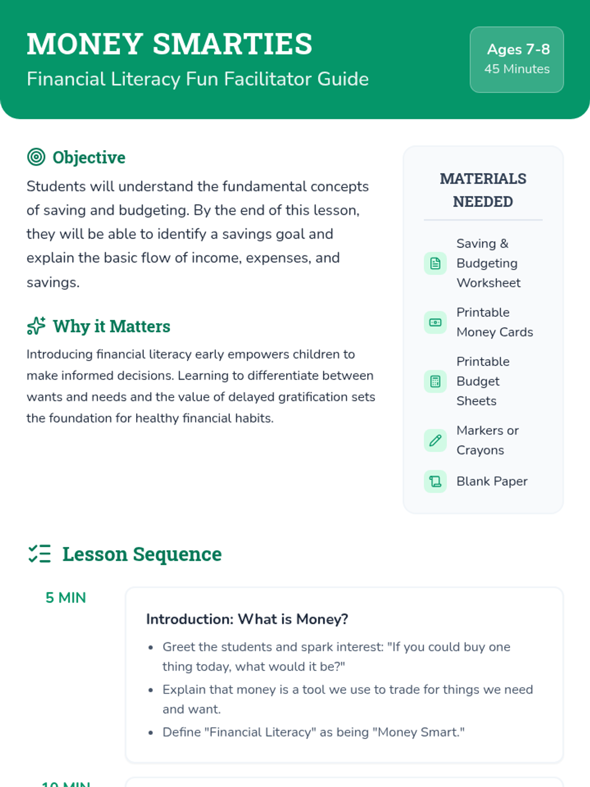 This lesson introduces young students to the basics of financial literacy, focusing on saving, budgeting, and the value of money through interactive activities.