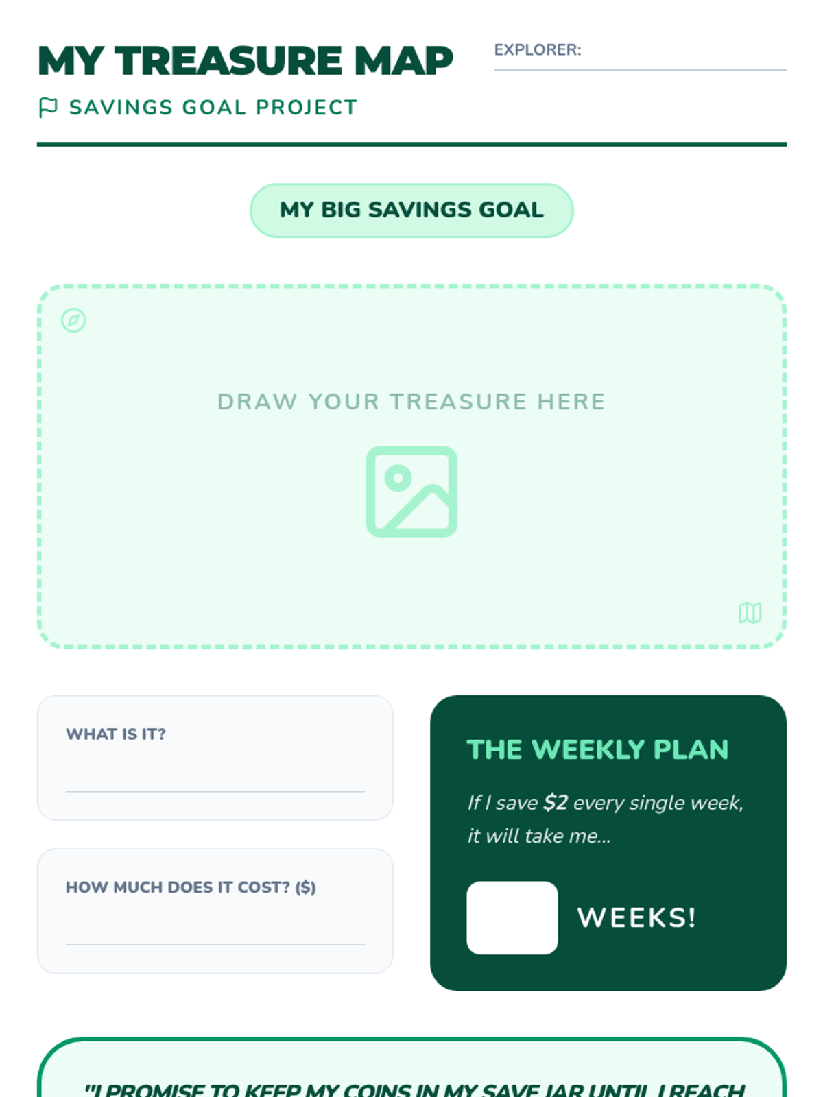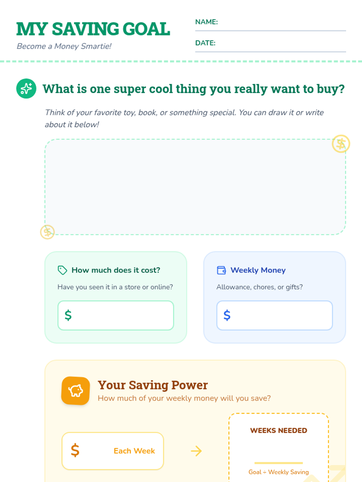 Students select a specific item or experience they want to save for, draw it, and estimate the time needed to reach their goal.