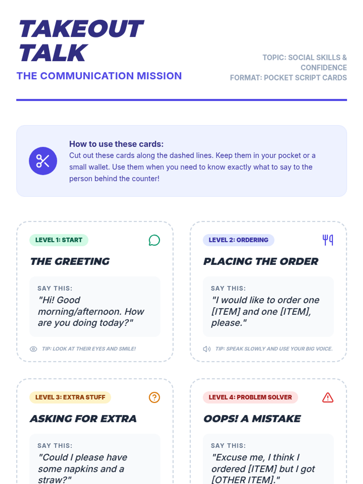 A practical lesson focused on the real-world social skills of ordering food, communicating with workers, and navigating a public restaurant space with confidence.