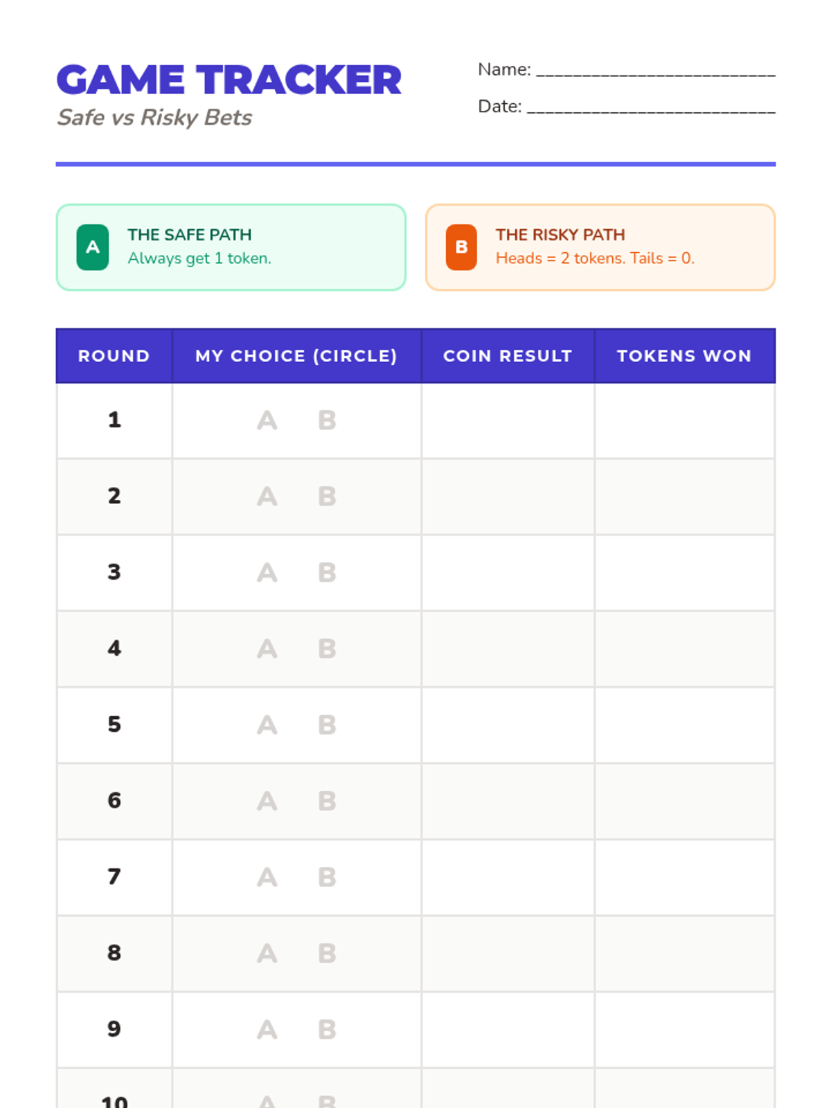 Students participate in a simulation to compare guaranteed small returns (safety) with high-risk/high-reward options (coin flips).