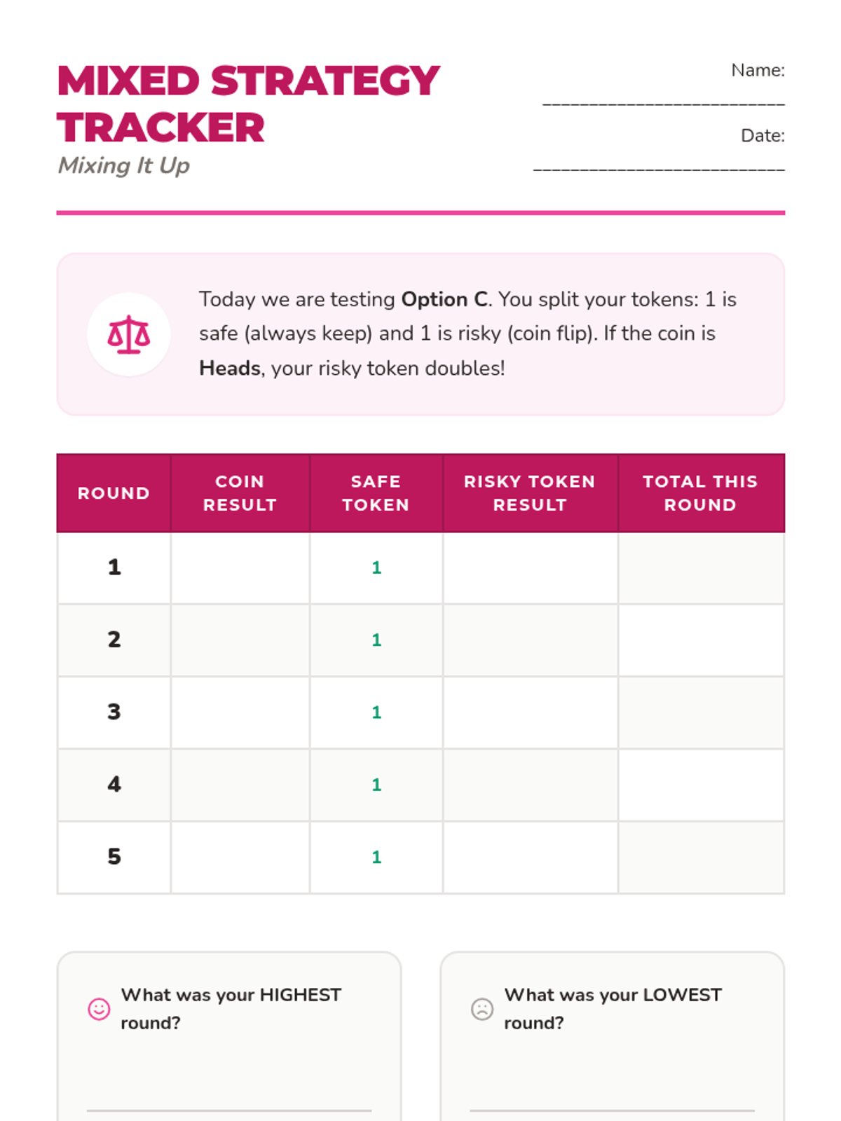 Students explore a 'mixed' strategy by splitting tokens between safe and risky options to see how diversification protects their wealth.