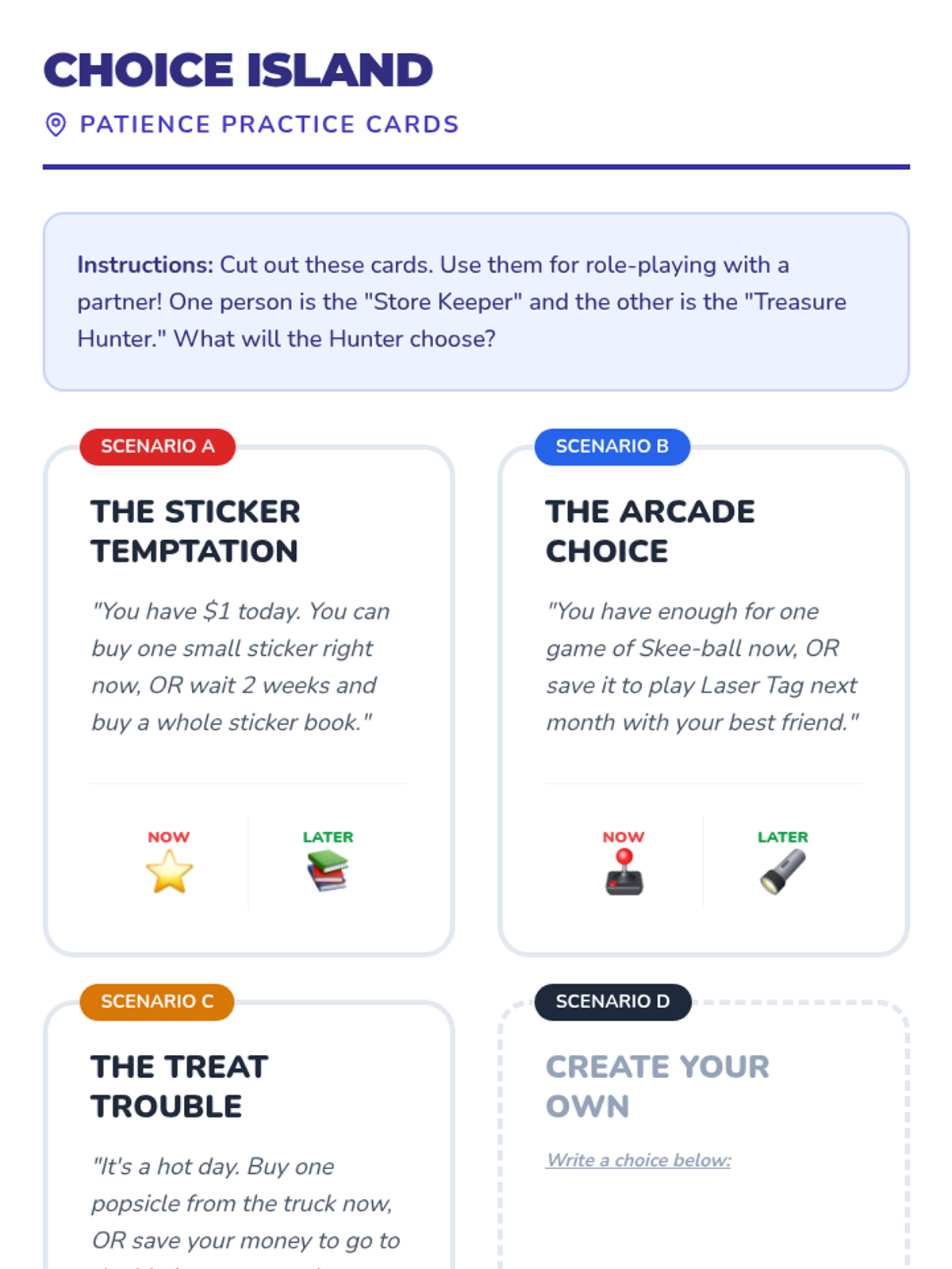 Through a role-playing activity and the 'Marshmallow Test' adaptation, students learn the benefits of waiting for a larger reward later.