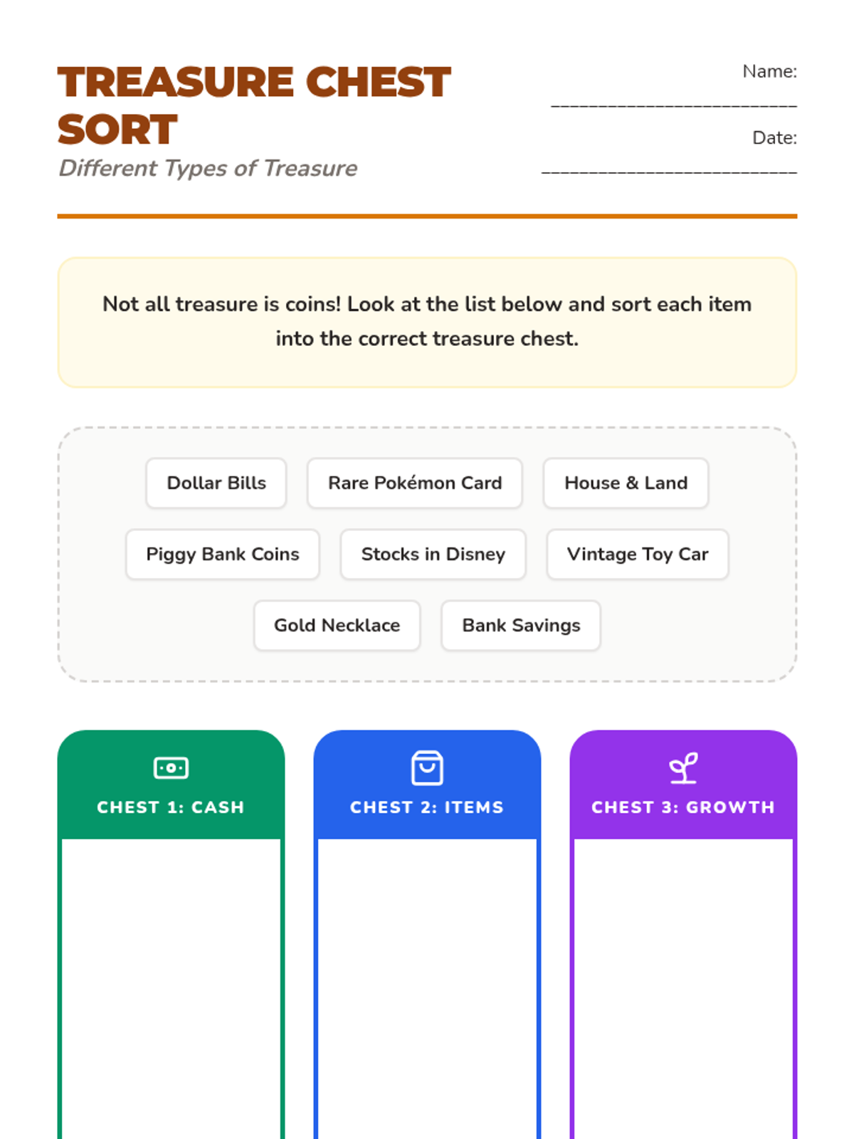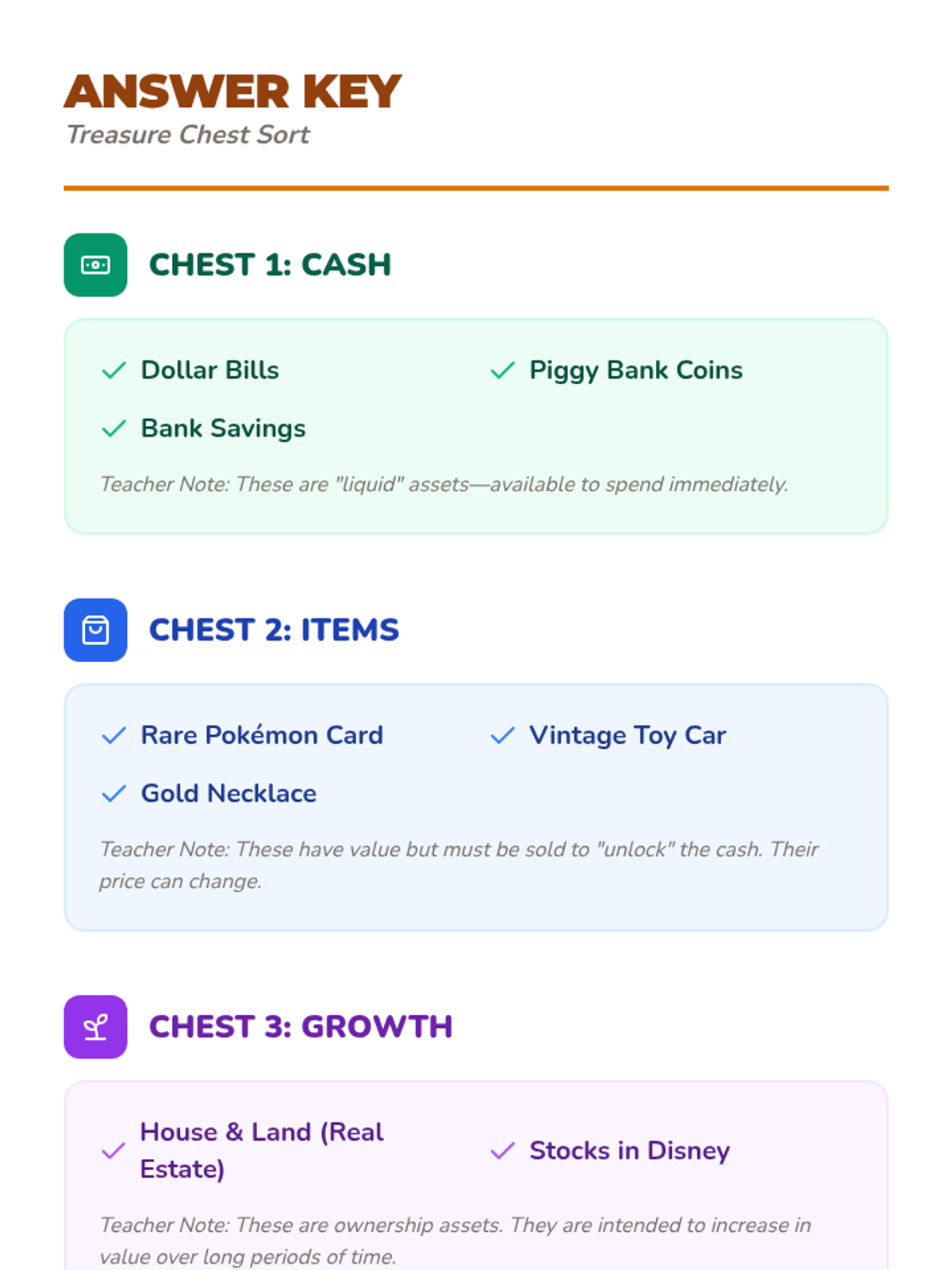 Students categorize different types of assets (cash, items, and investments) to understand how variety provides financial security.