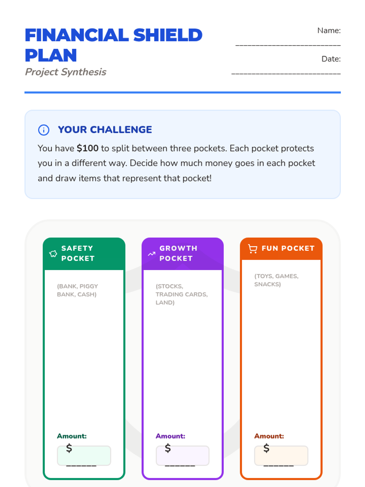 Students synthesize their learning by designing a 'Financial Shield' poster that represents their diversified saving and investing plan.