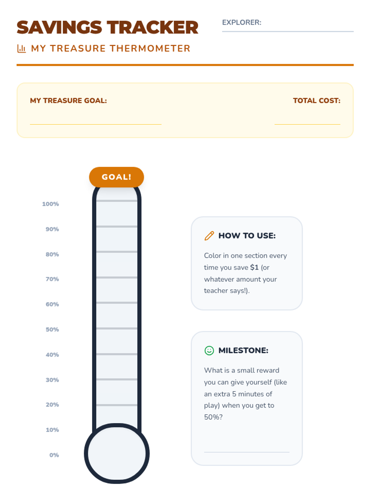 Students create and practice using visual progress trackers, like thermometers, to represent their journey toward their financial goals.