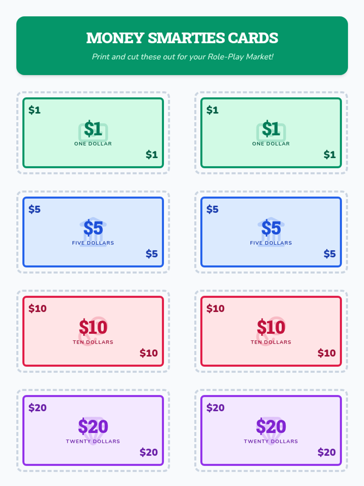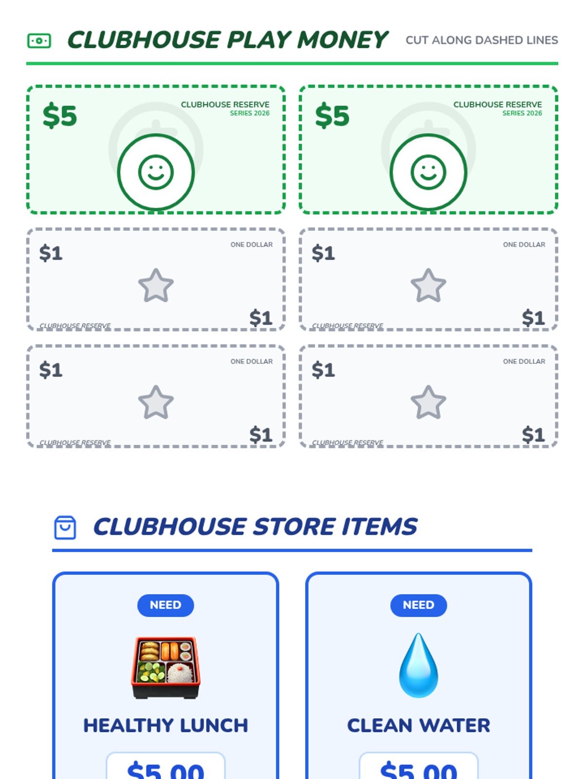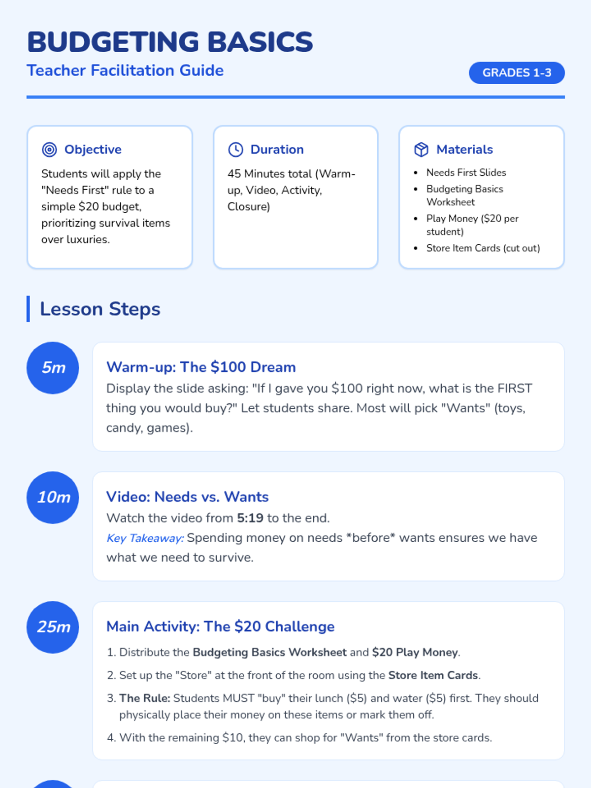 Students learn the difference between needs and wants and practice the 'Needs First' rule by managing a $20 budget to purchase essentials before luxuries.