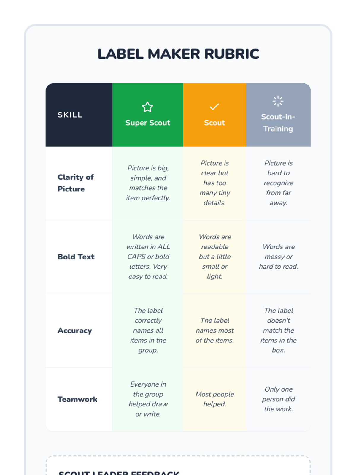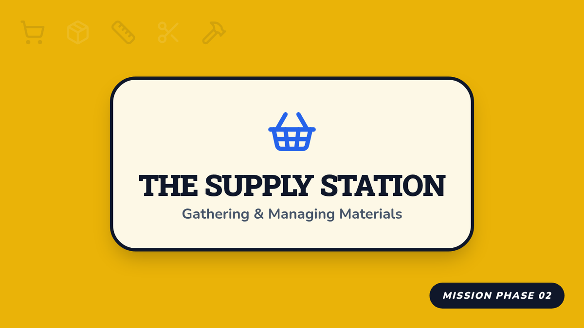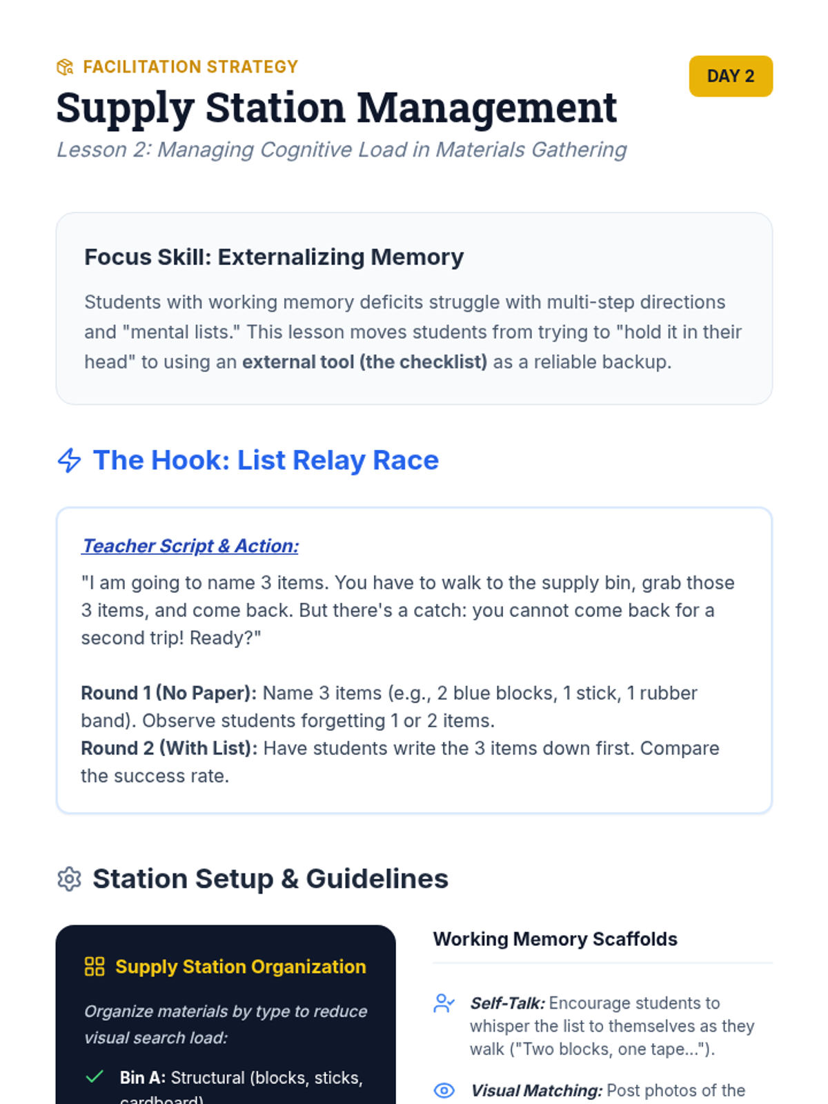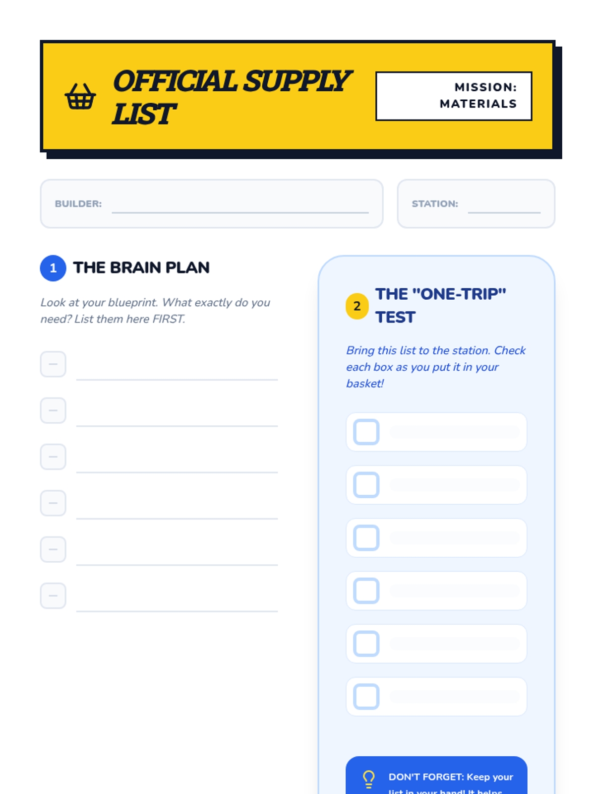 Students must identify the specific materials needed for their design. They practice using a checklist to gather items from a supply station in one trip, challenging their working memory capacity.