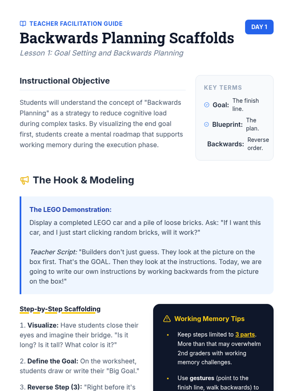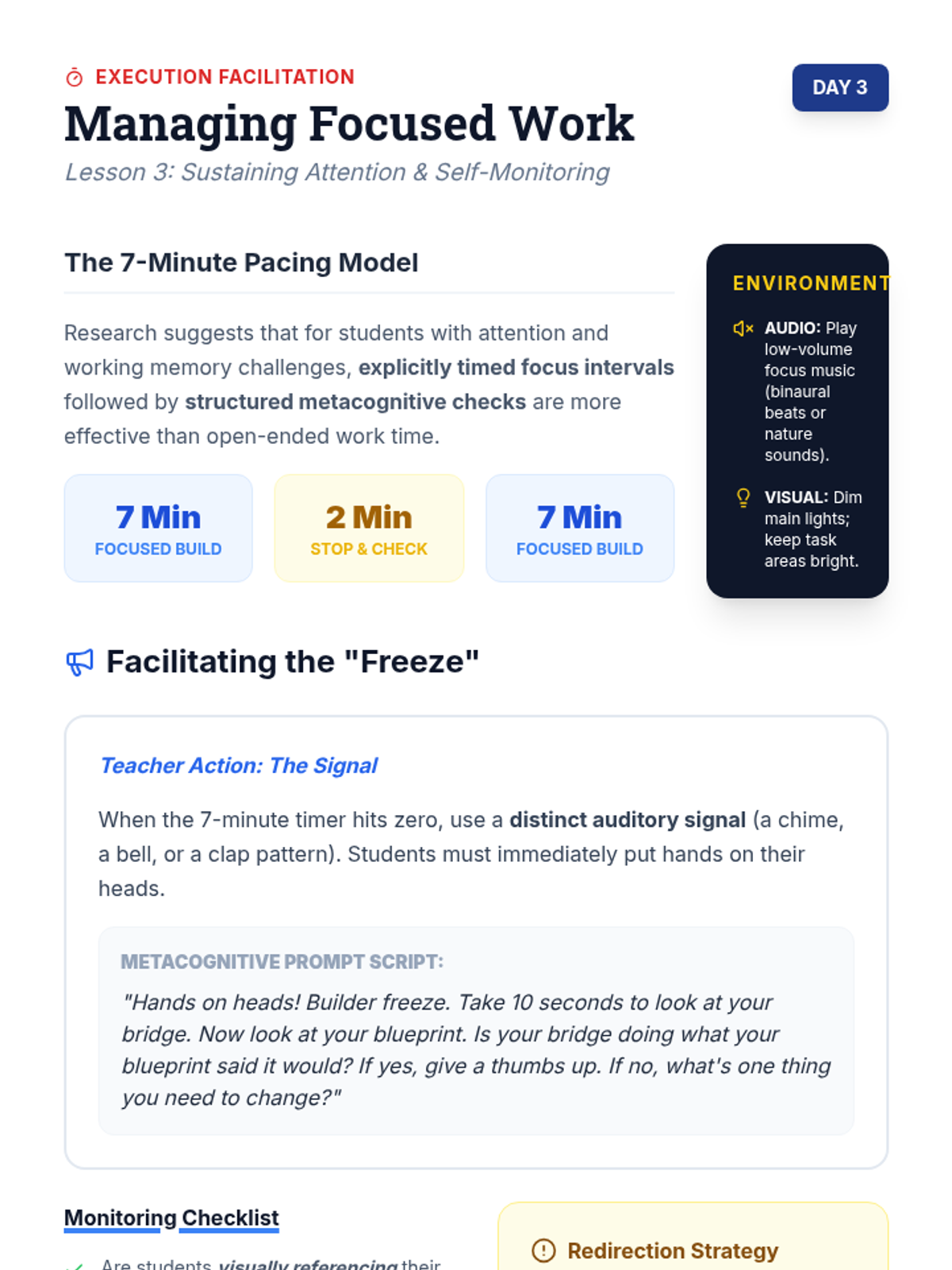 Students present their final structures and reflect on which memory tool helped them the most (the checklist, the quiet time, or the planning). They discuss how to use that same tool in Math or Reading class.