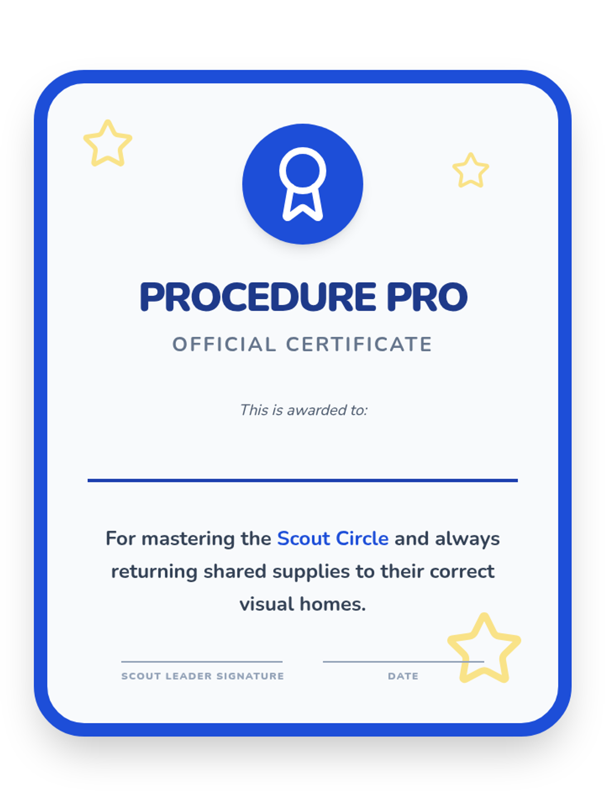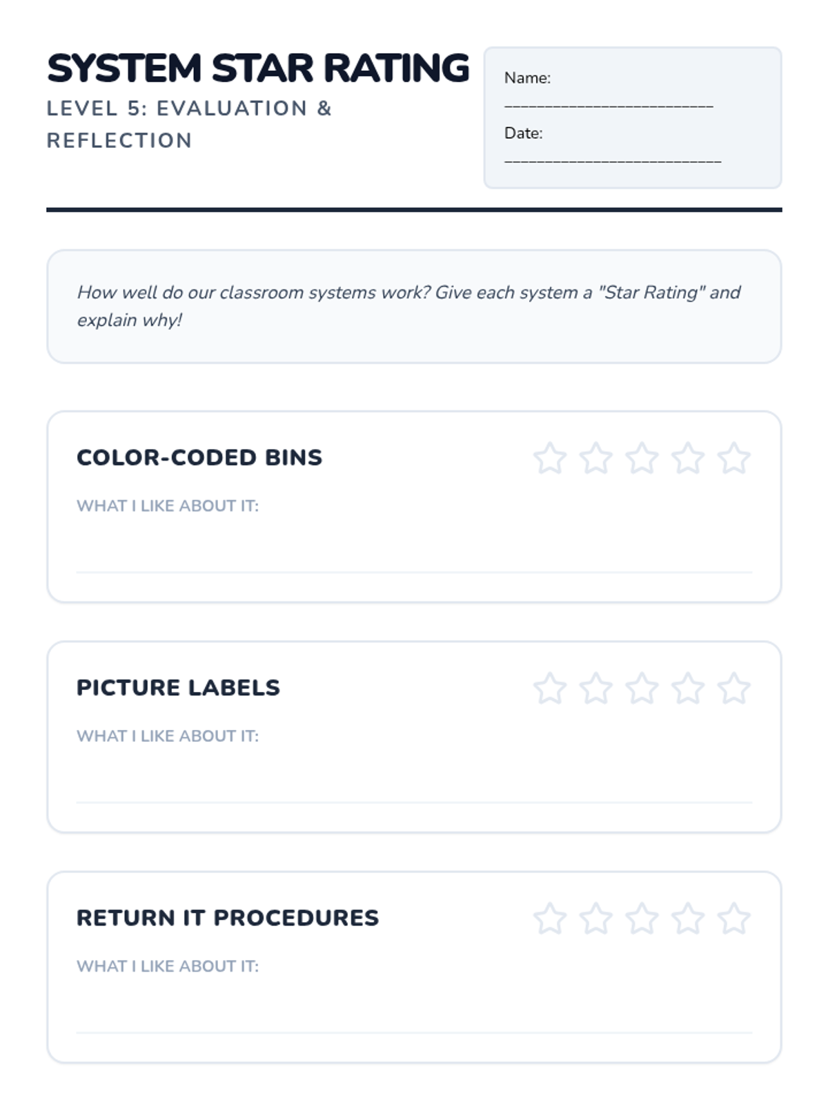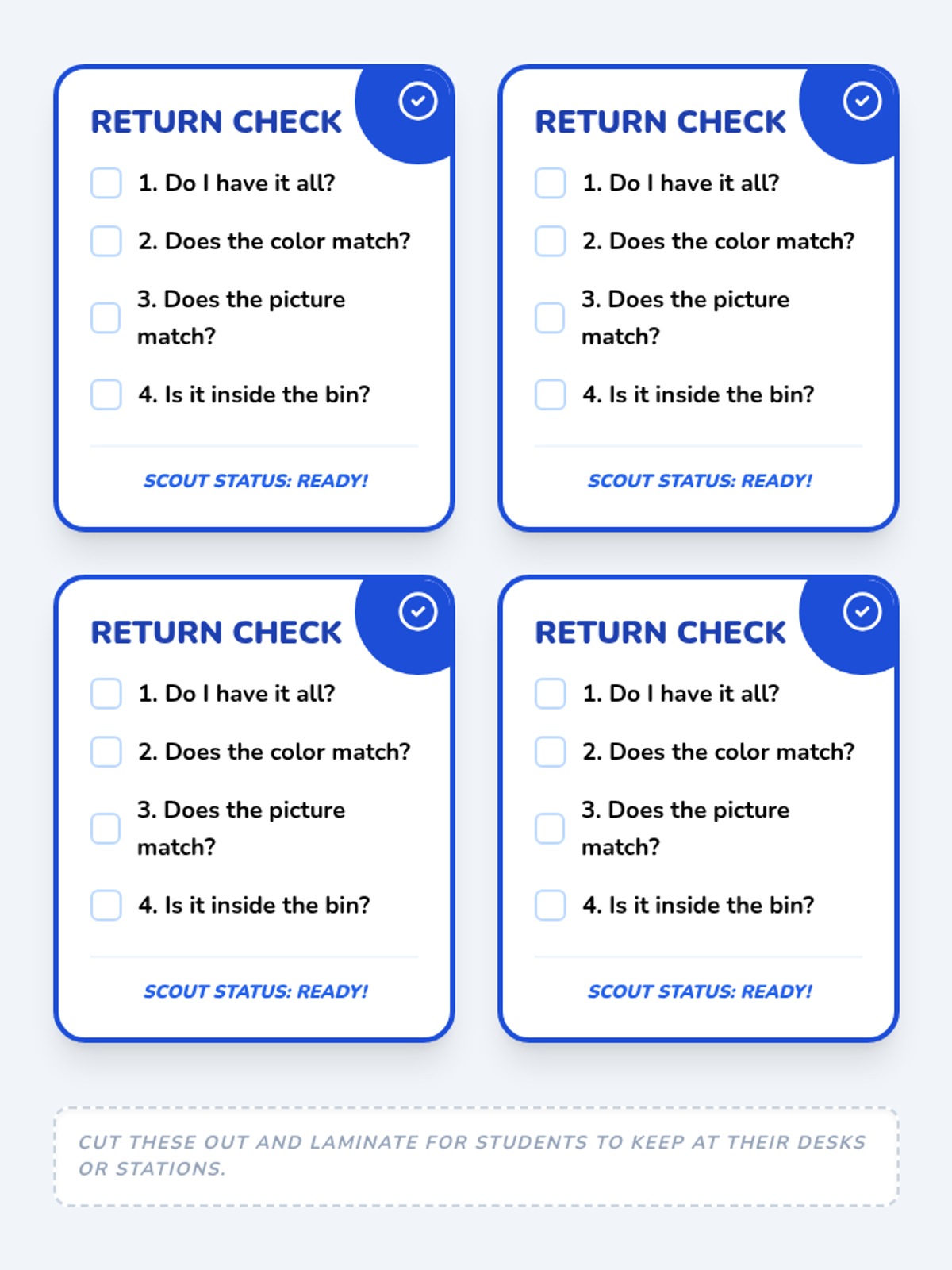 Students role-play the correct process for taking an item from a shared visual system and returning it exactly to the matching label.