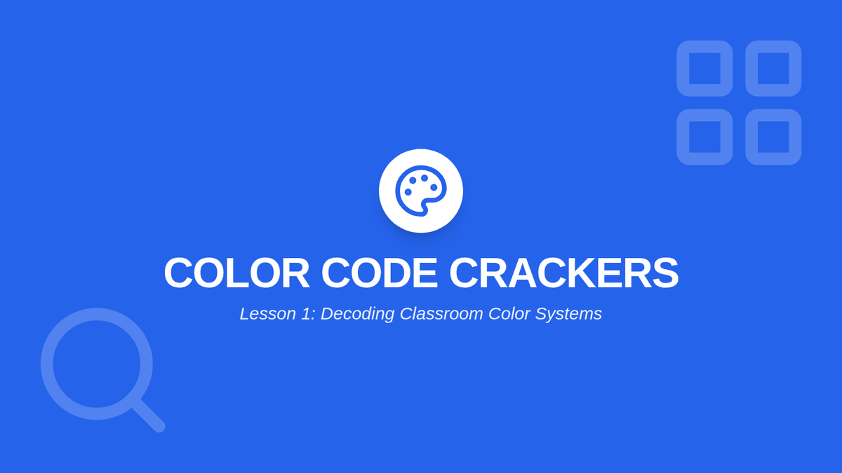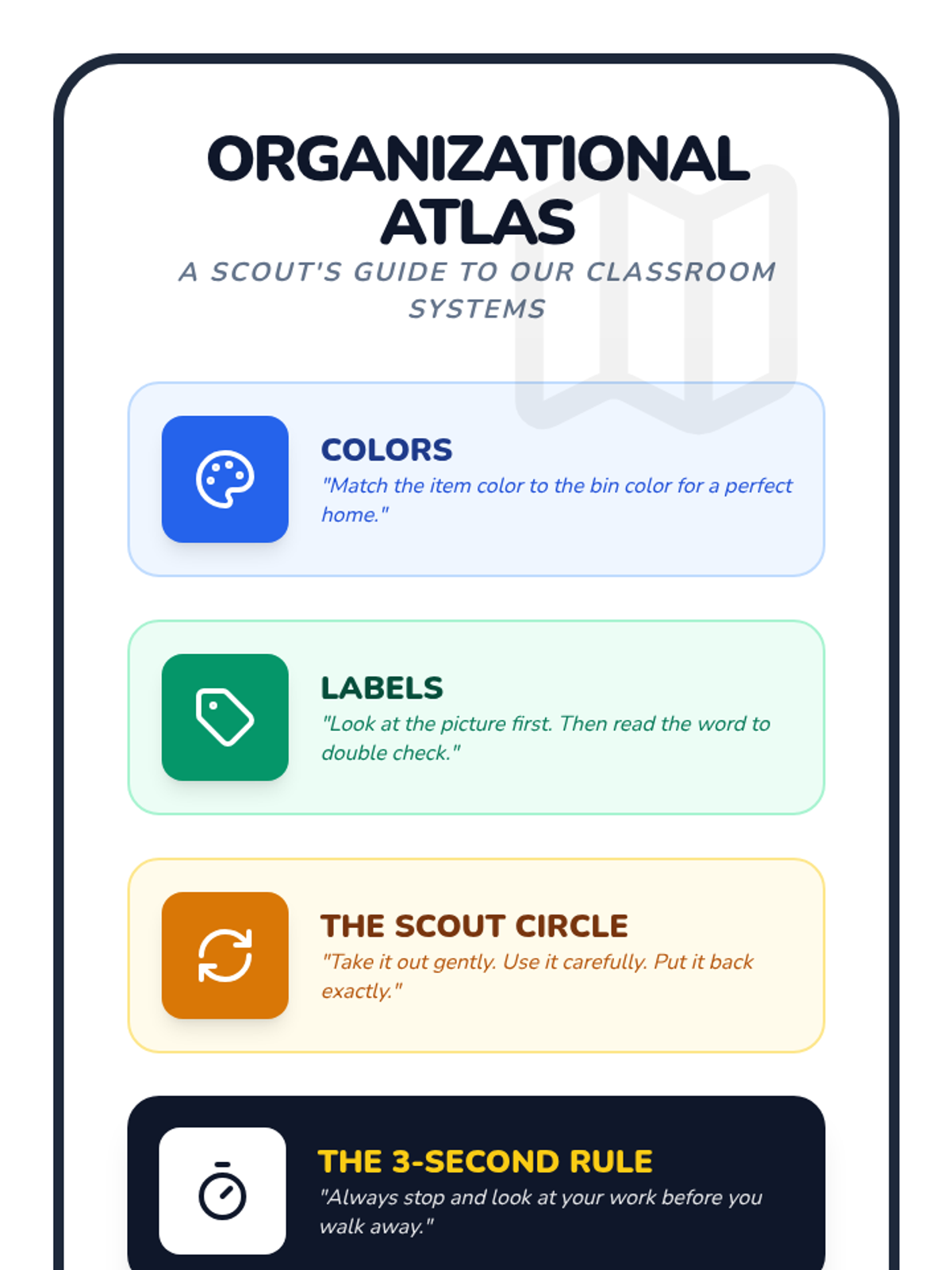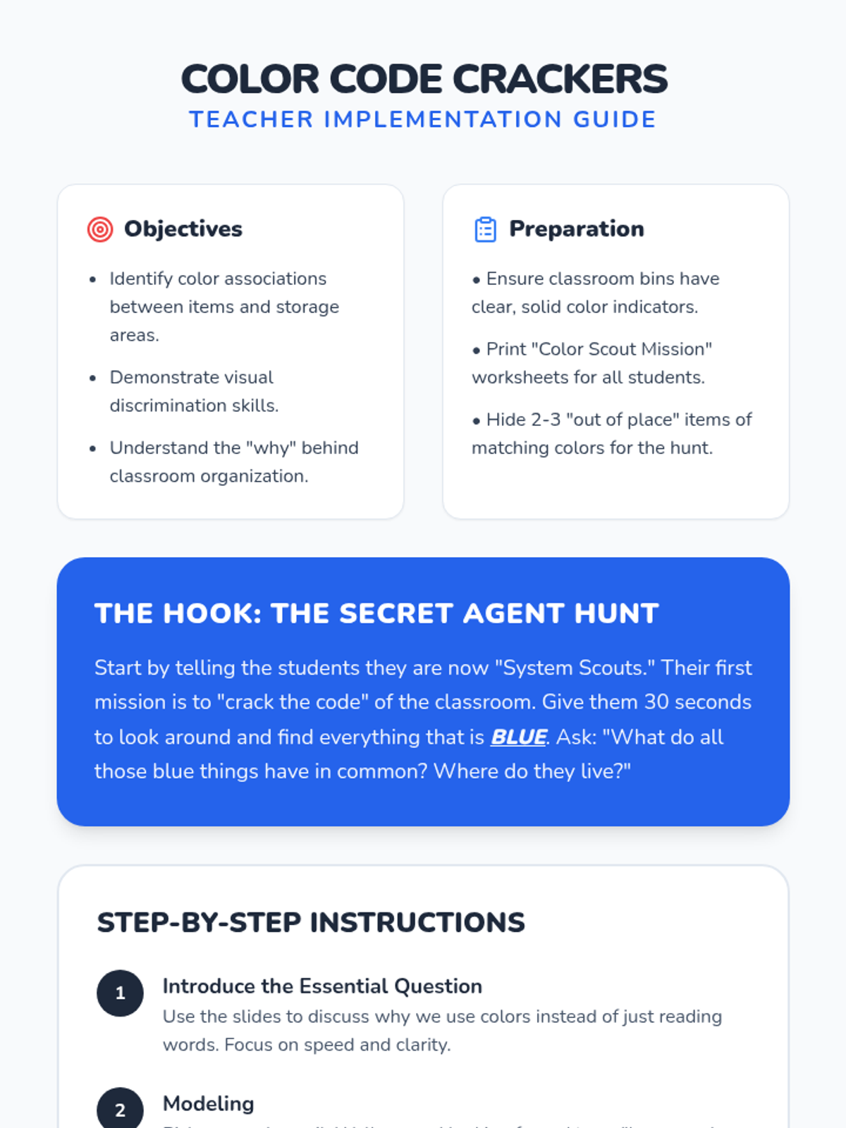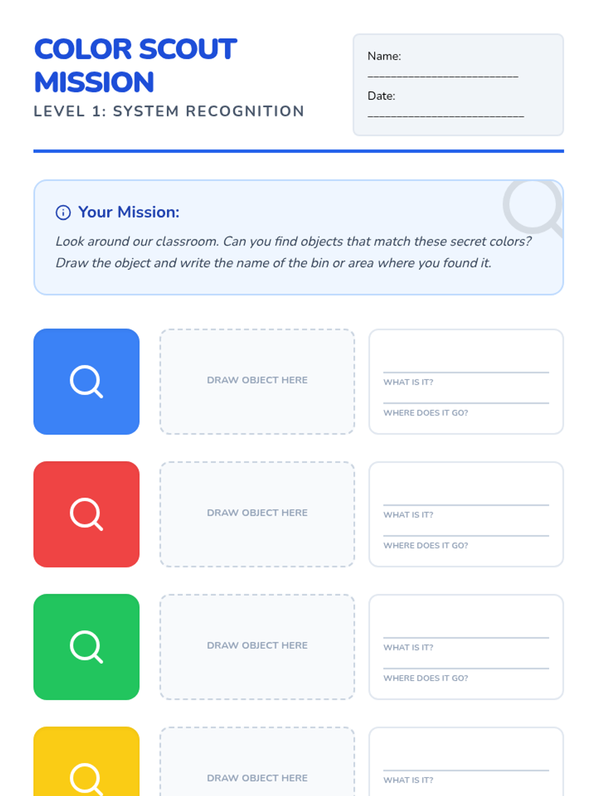 Students explore the classroom to identify color-coded connections (e.g., blue folder matches the blue math bin) and participate in a scavenger hunt to reinforce these associations.