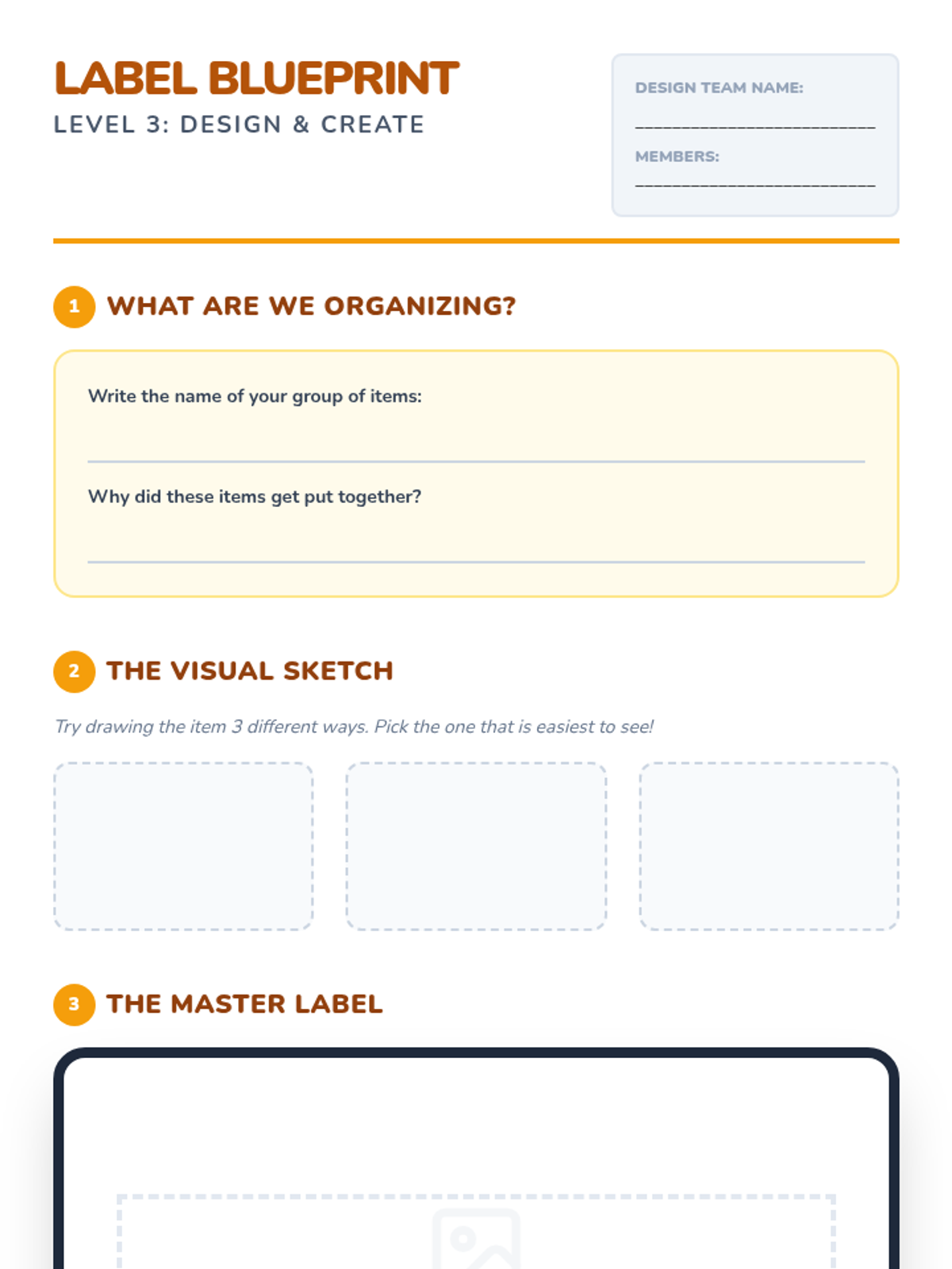 Students work in small groups to design clear, helpful labels for a disorganized section of the classroom, focusing on clarity and visual-word association.