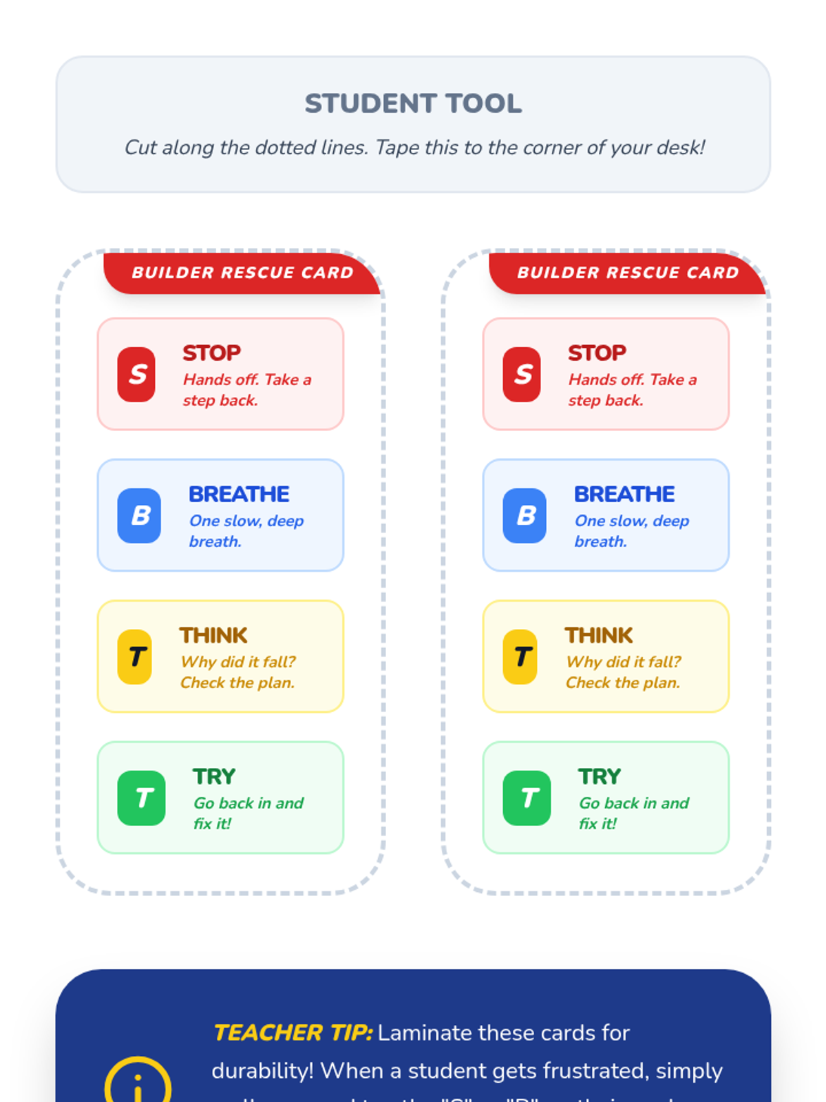 When students encounter a structural failure or mistake, they use a 'Problem Solving Protocol' (Stop, Breathe, Think, Try) rather than getting frustrated. This explicitly teaches emotional regulation during cognitive stress.