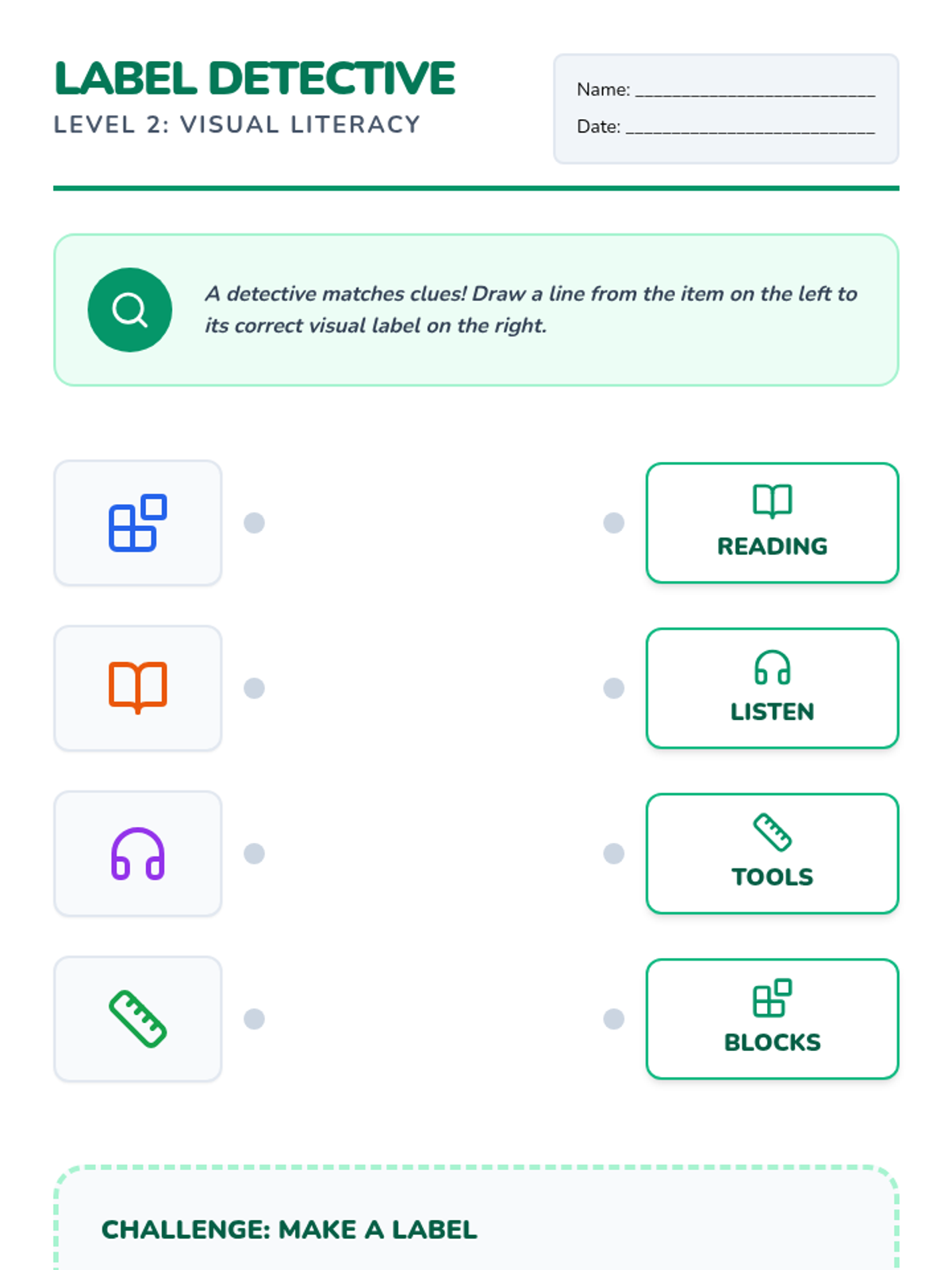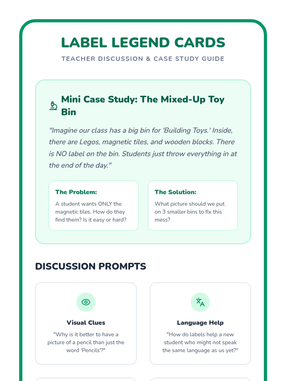 Students examine various picture labels used on bins and shelves to understand how images assist navigation and item placement.