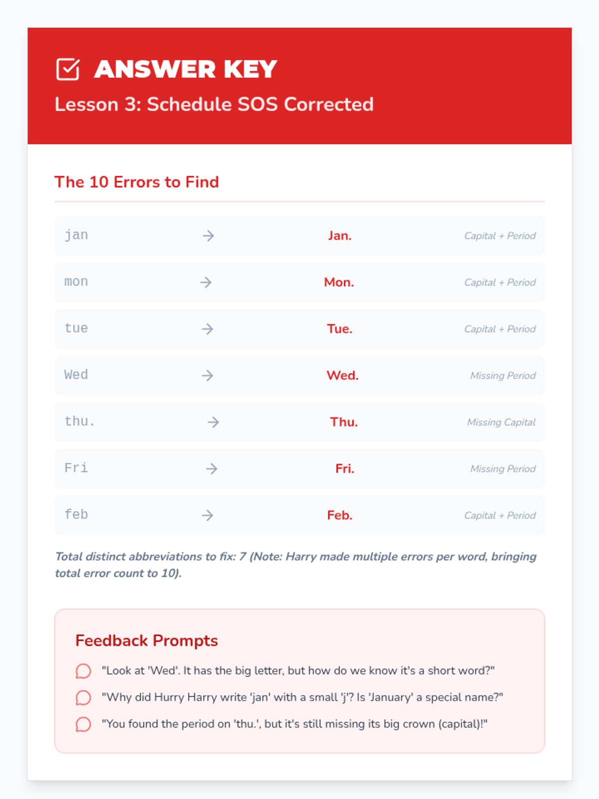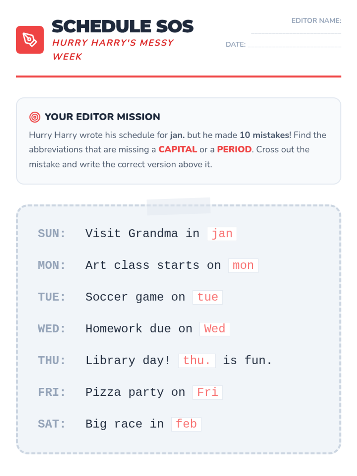 A focused grammar lesson on the specific punctuation rules for temporal abbreviations. Students act as 'editors' to correct a messy schedule that lacks periods or capital letters.