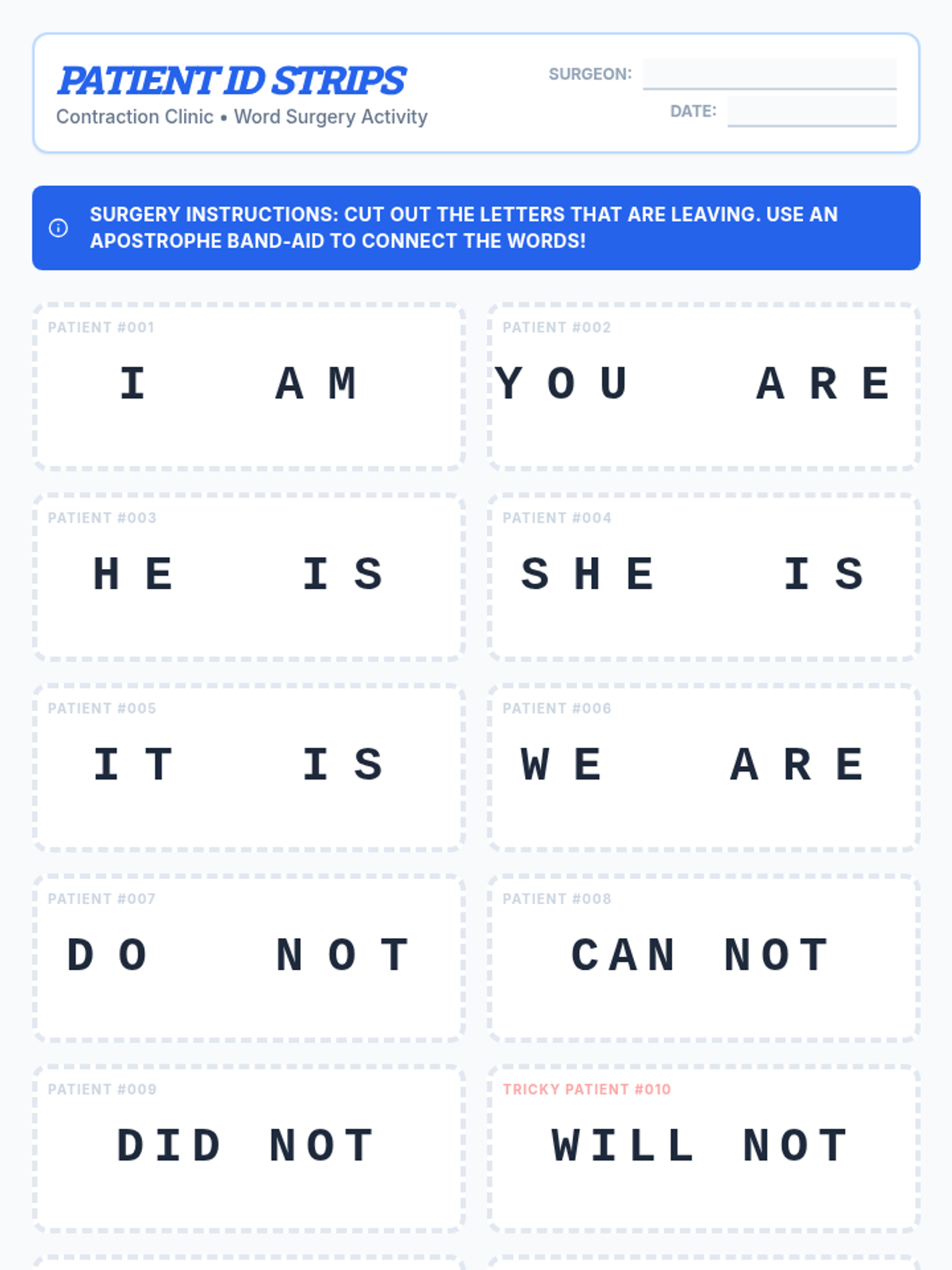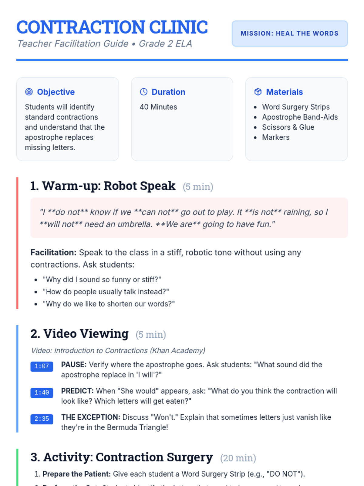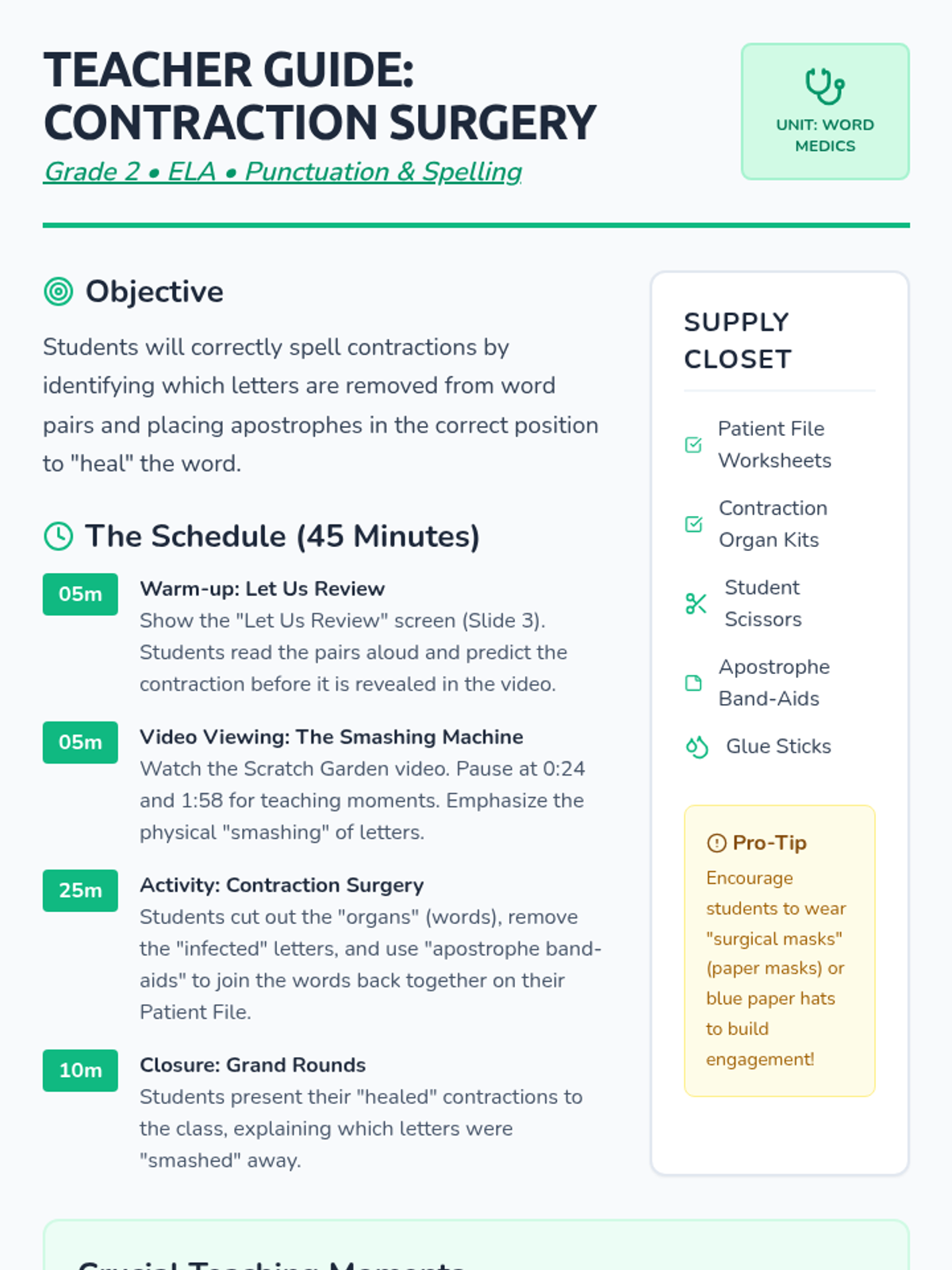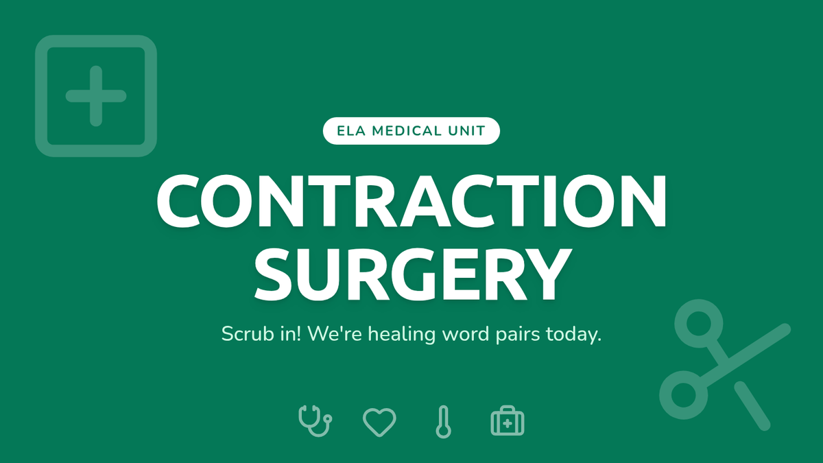 A medical-themed lesson where 2nd-grade students become 'surgeons' to perform 'Contraction Surgery,' removing letters and 'bandaging' words back together with apostrophes. includes a video guide, hands-on activity, and student recording sheets.