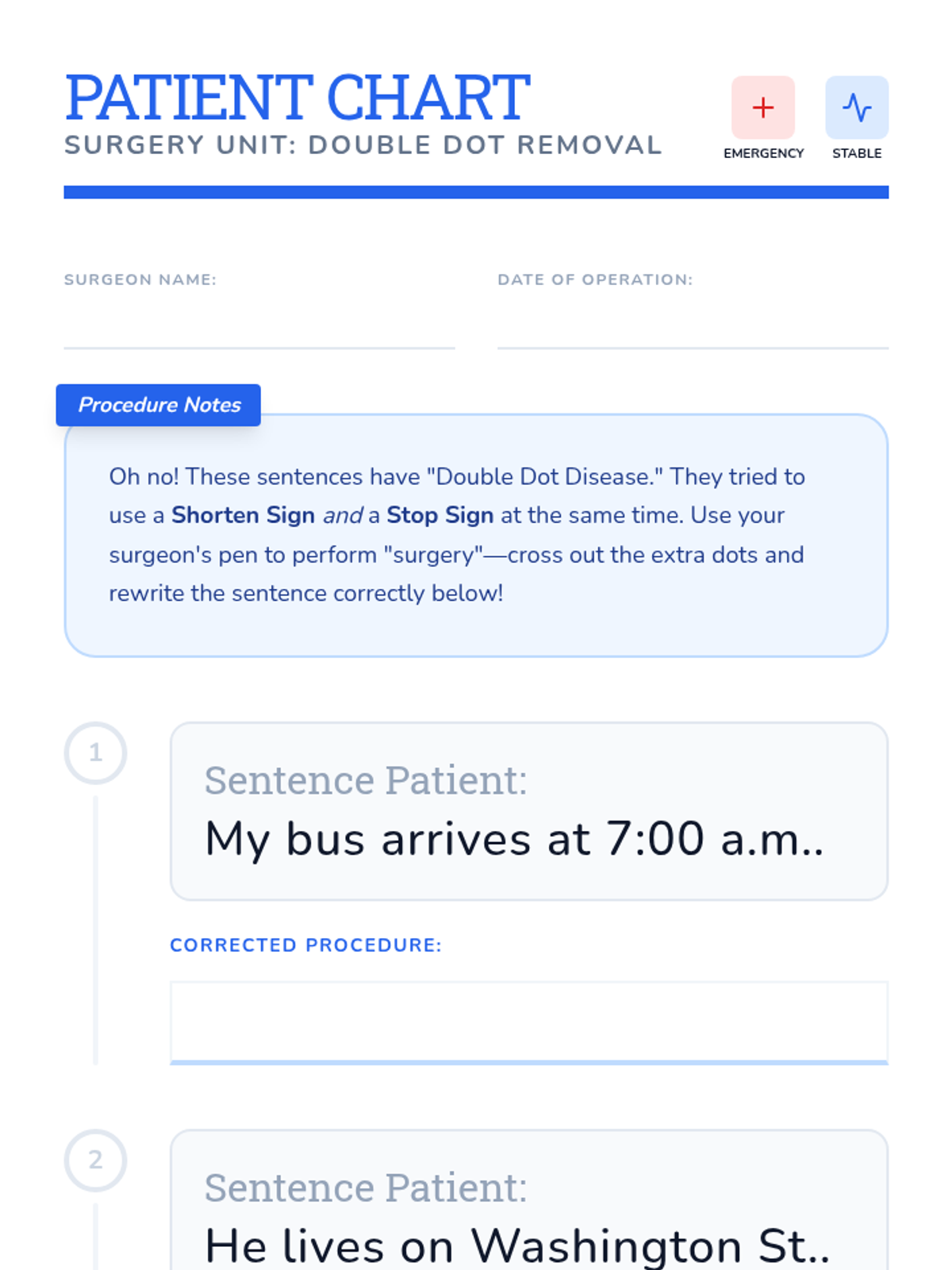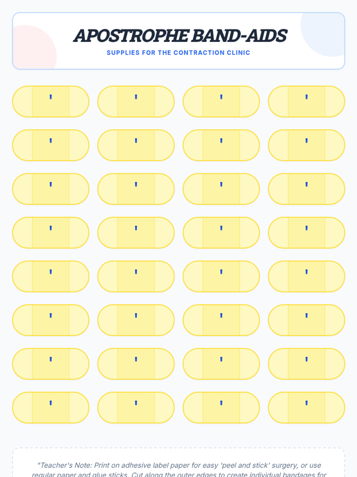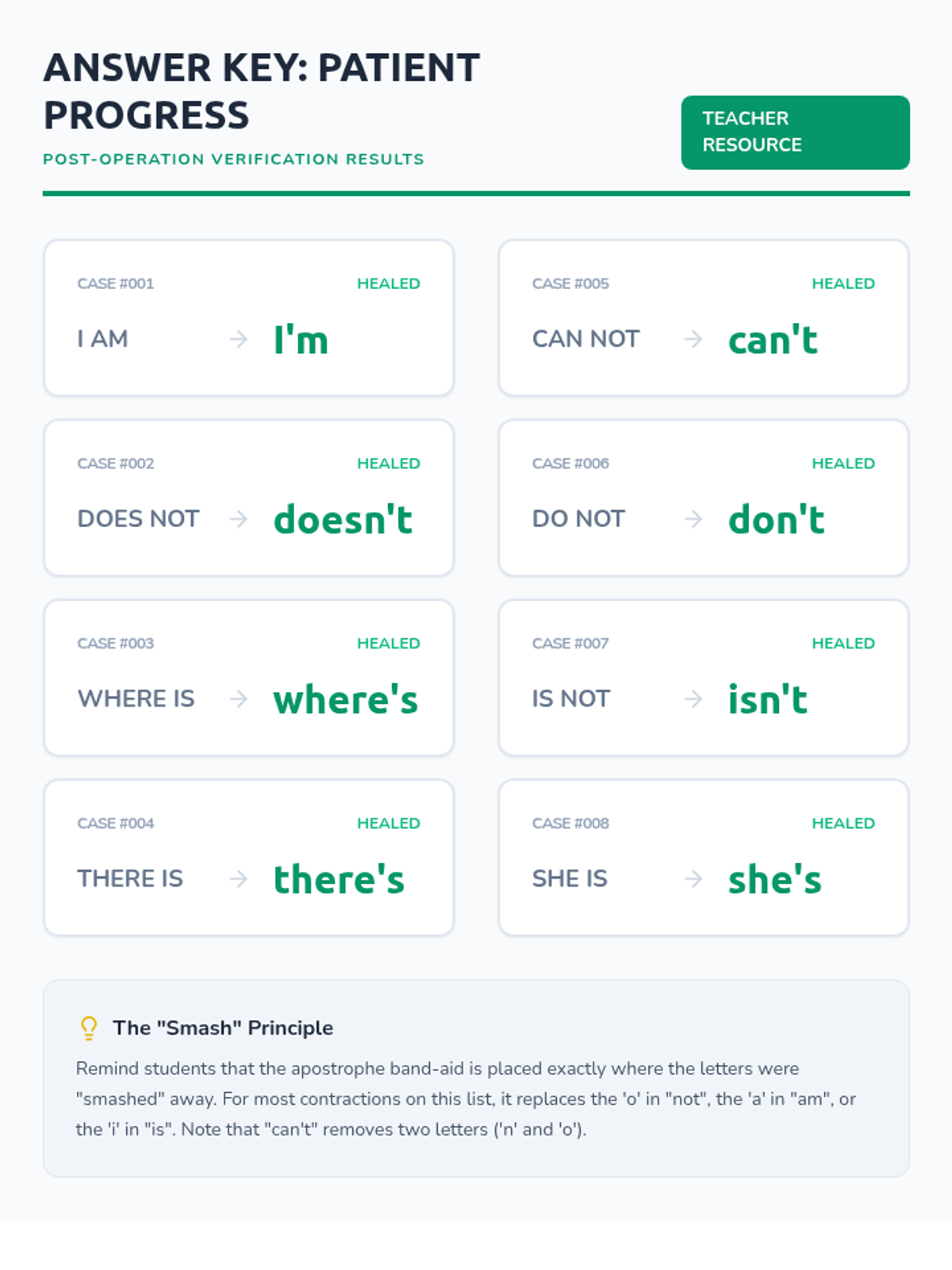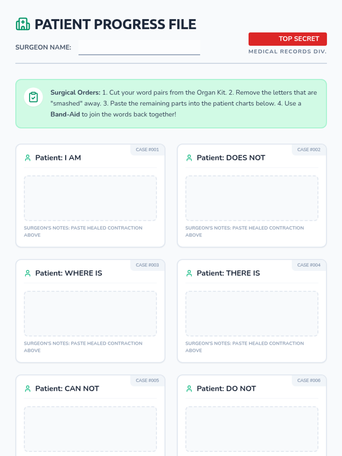 A medical-themed lesson where 2nd-grade students become 'surgeons' to perform 'Contraction Surgery,' removing letters and 'bandaging' words back together with apostrophes. includes a video guide, hands-on activity, and student recording sheets.