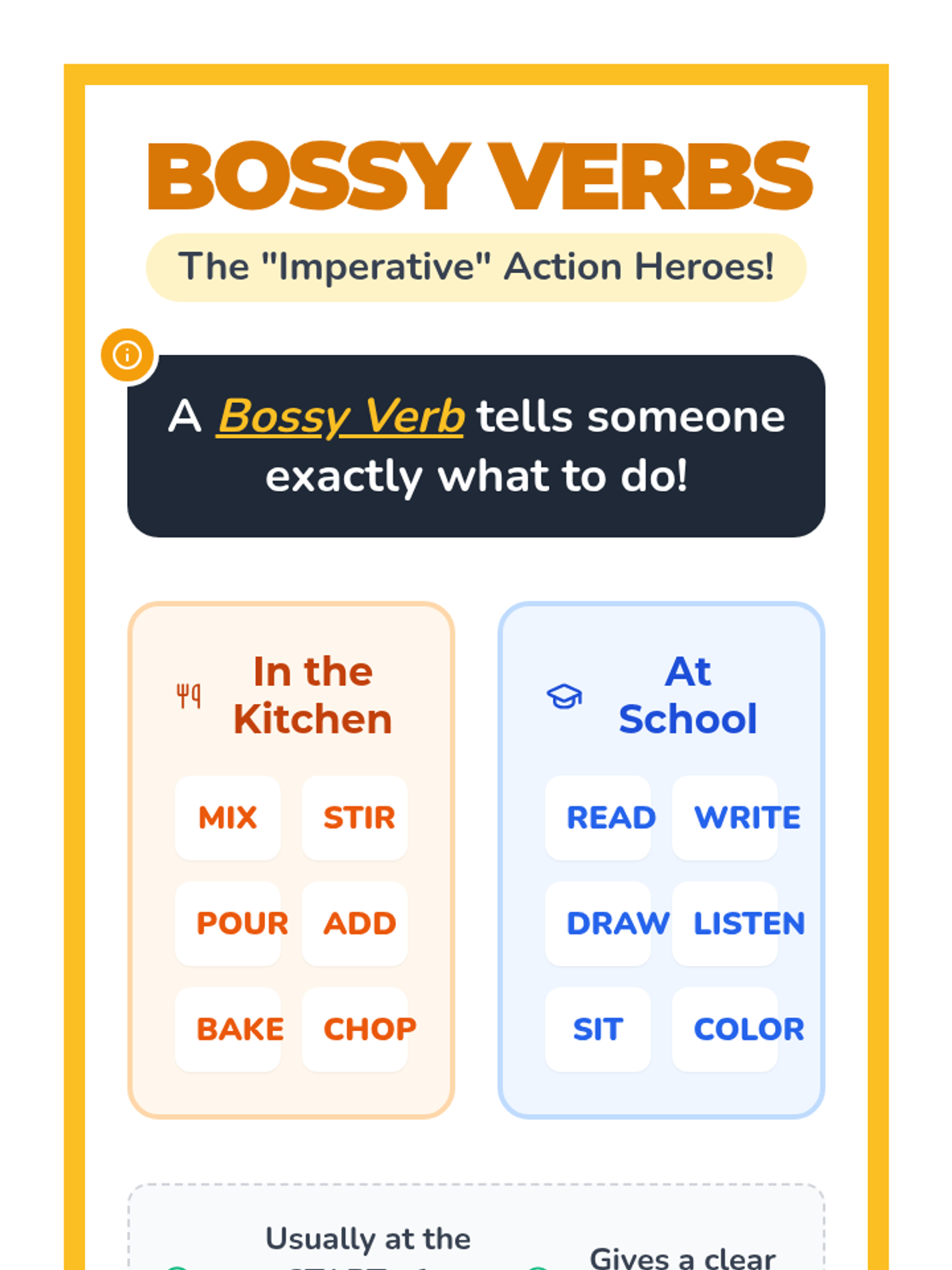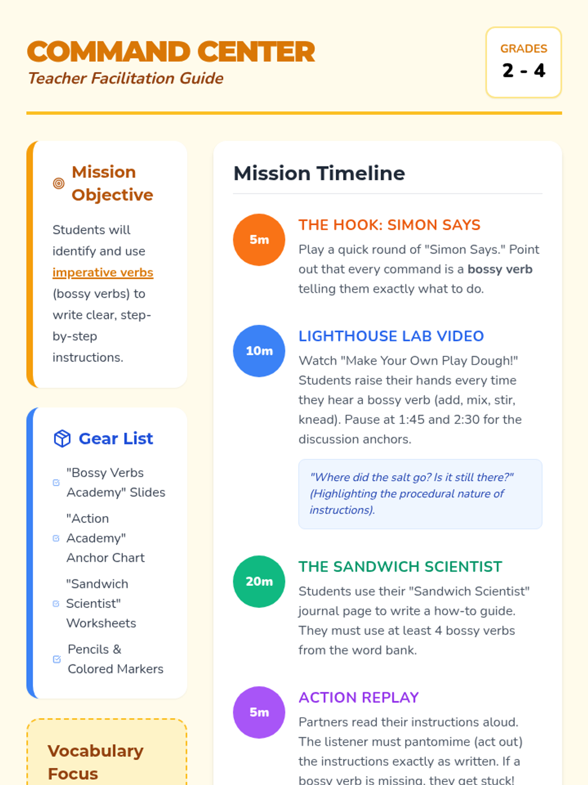 A fun, interactive ELA lesson for grades 2-4 where students become 'Bossy Verb' experts. Using a playdough-making video as a model, students identify imperative verbs and apply them to write their own step-by-step sandwich recipes.