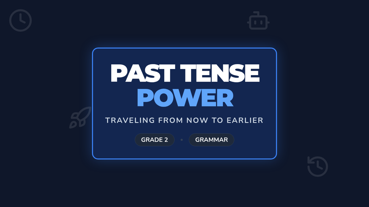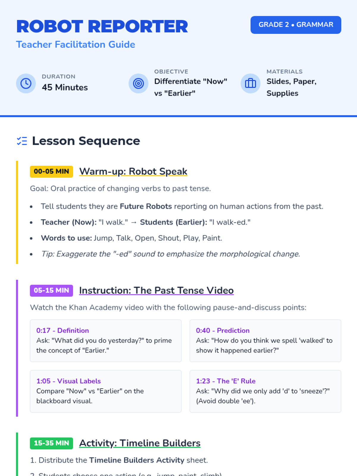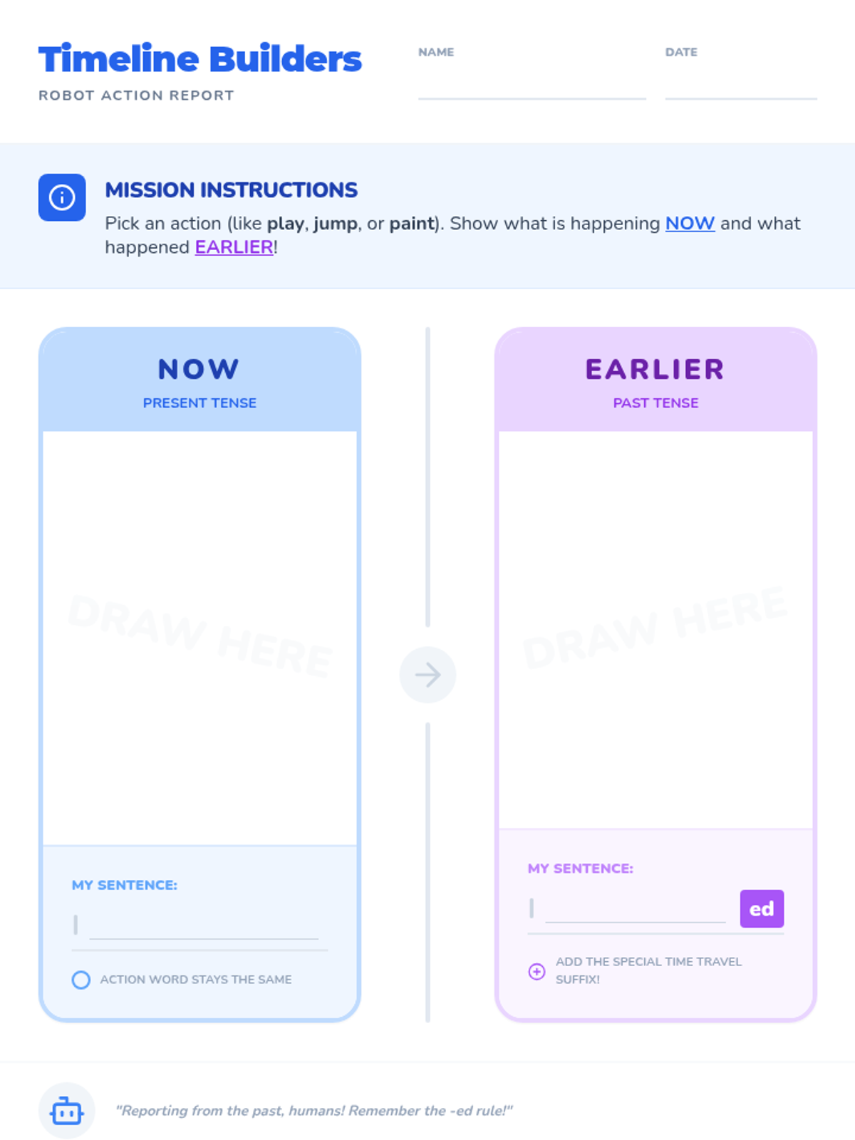 Students learn to identify and form past tense verbs by comparing 'now' actions with 'earlier' actions, using the -ed suffix and a 'Robot Speak' warm-up.