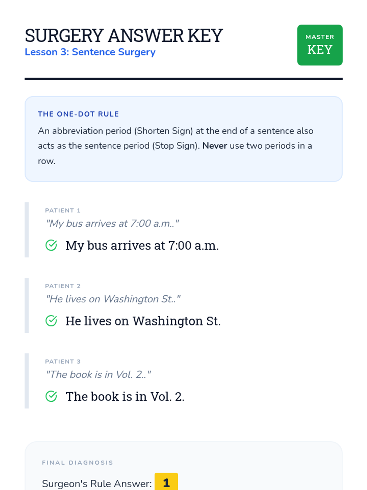 Focuses on the complex rule of sentence-ending abbreviations, teaching students that one period can serve both as an abbreviation marker and a sentence stopper.