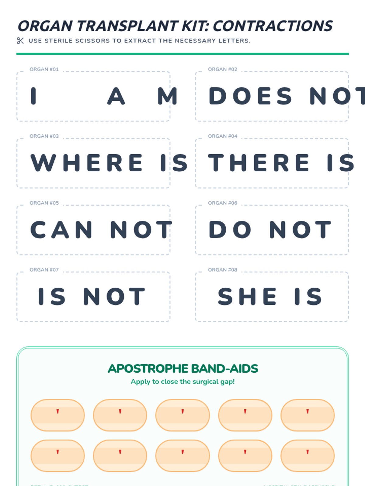 A hands-on lesson for 2nd graders to learn contractions through 'word surgery,' involving cutting word pairs and replacing missing letters with apostrophe band-aids.