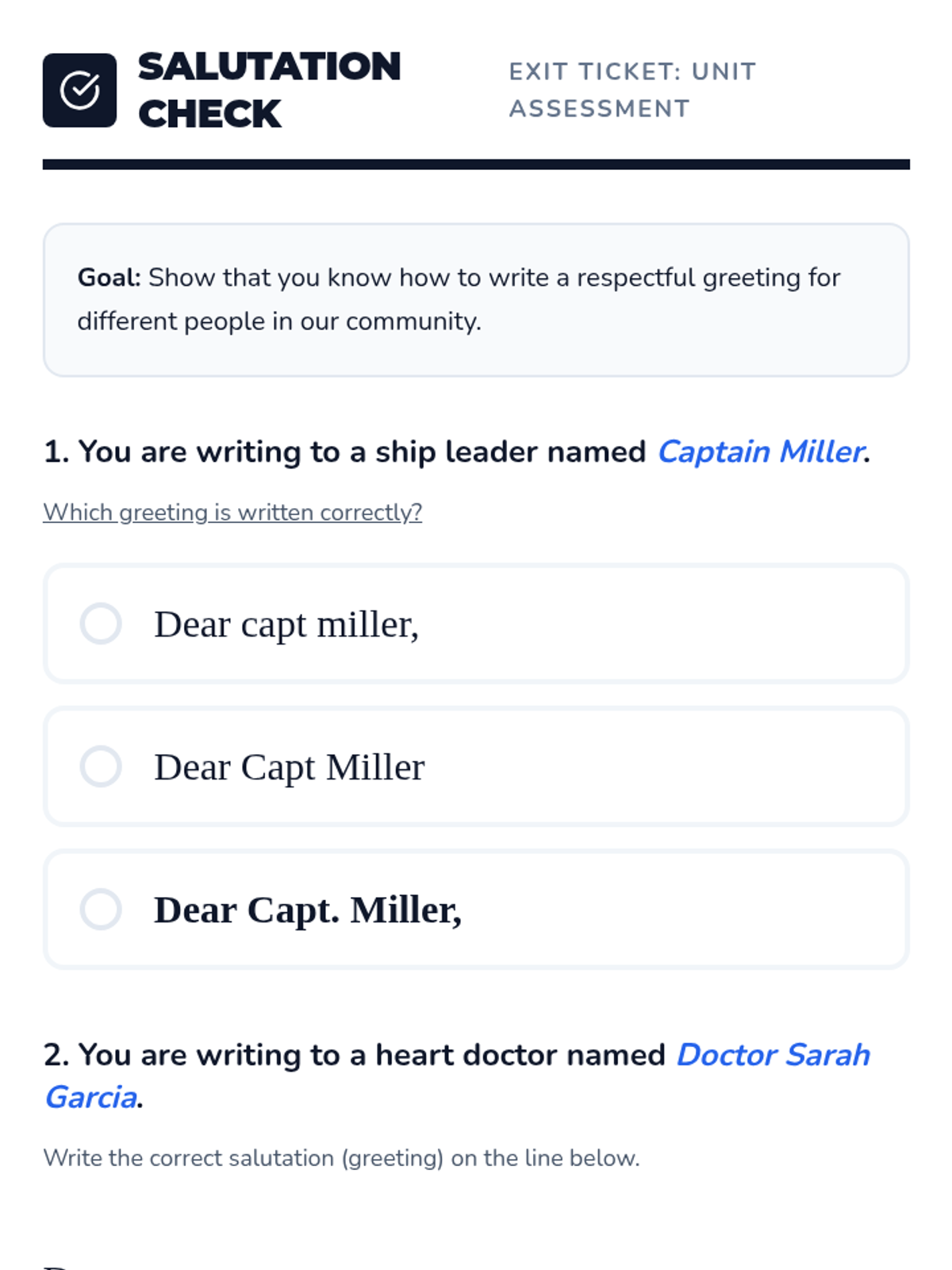 Students learn the standard social titles (Mr., Mrs., Ms., Jr., Sr.) and the rules for their use. Discussion focuses on the importance of the period and the capital letter to show respect.