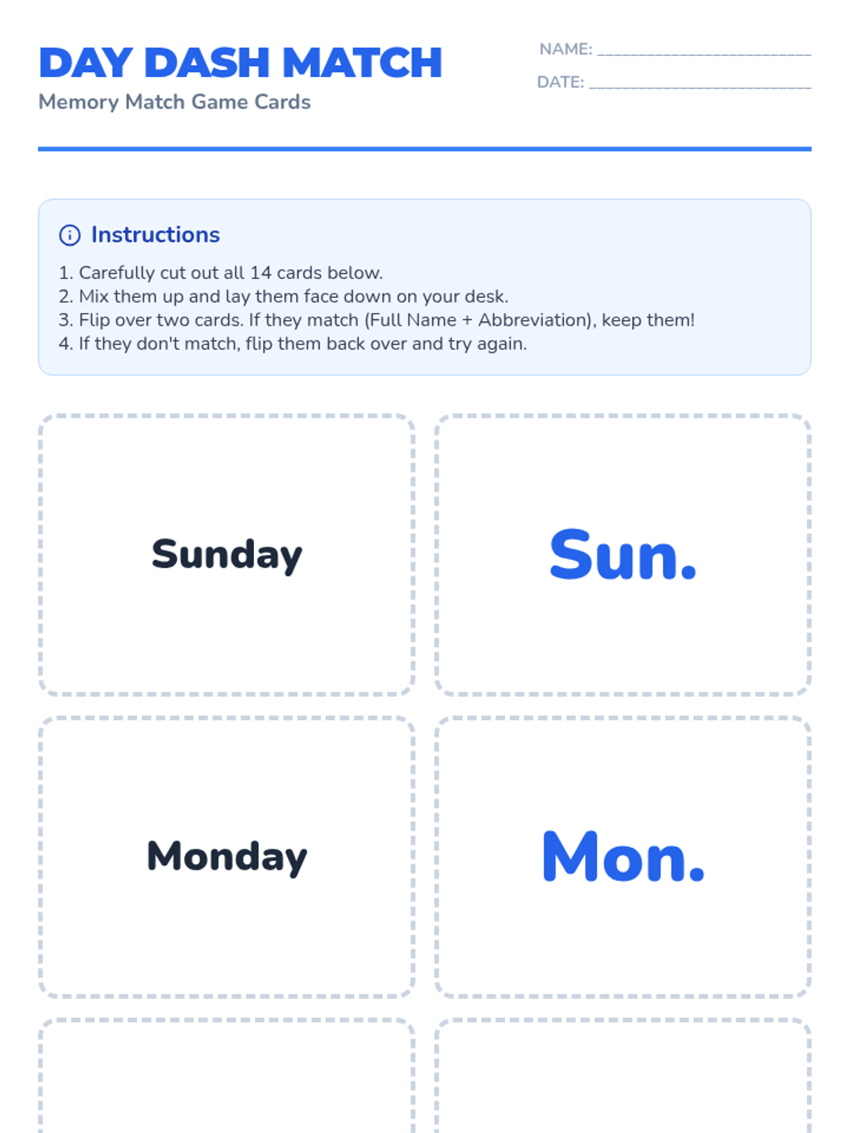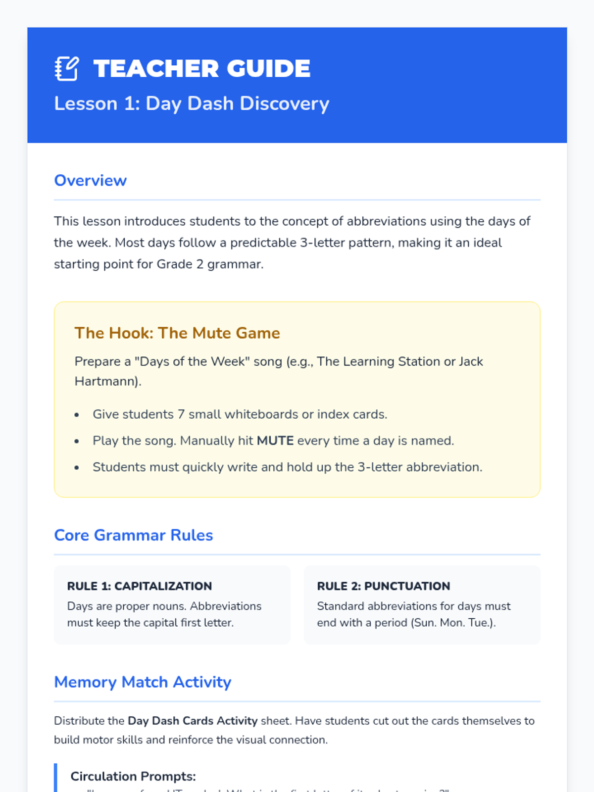 Students list the days of the week and learn the standard three-letter abbreviations. They practice matching full names to abbreviations through a memory game.