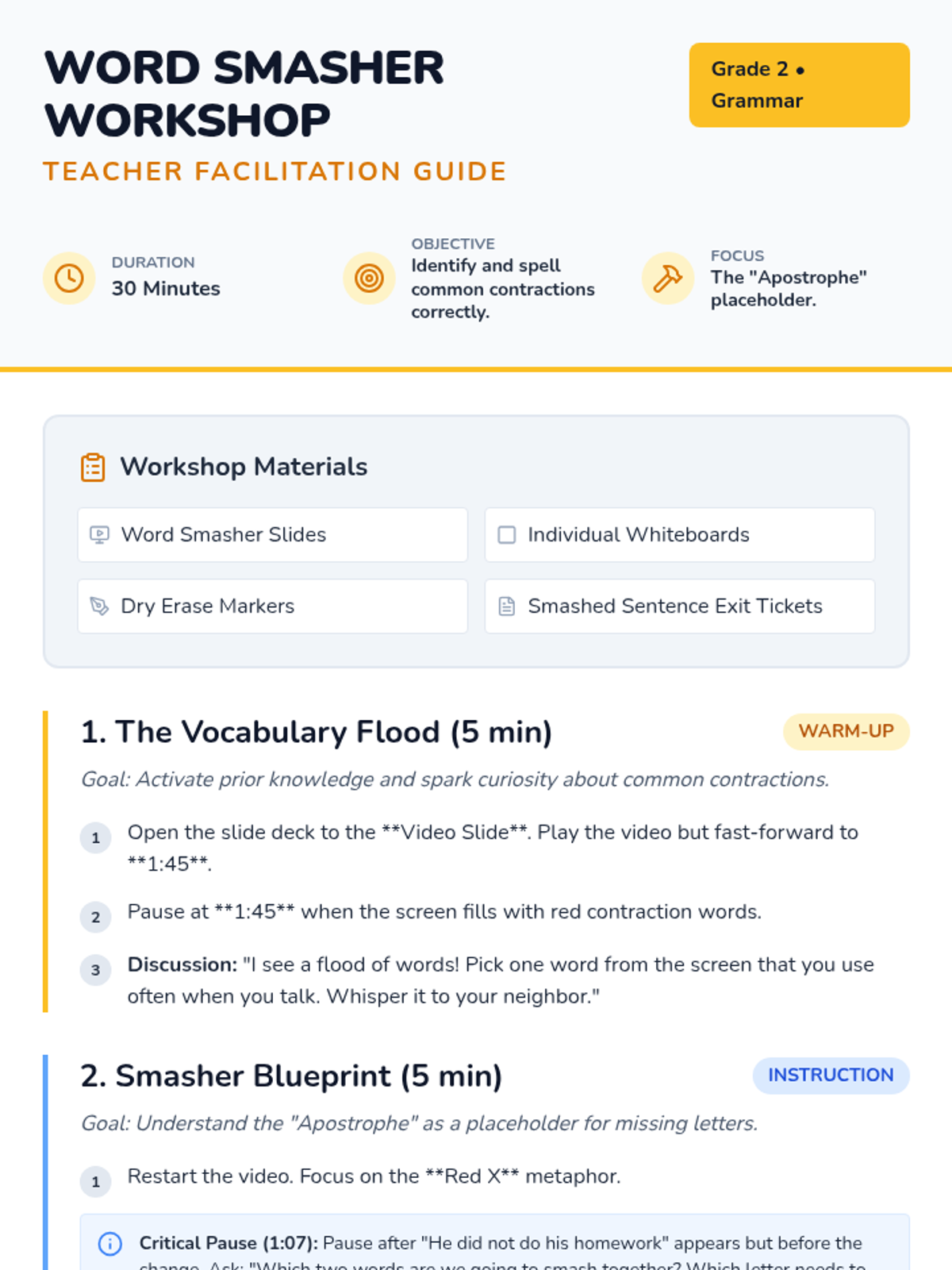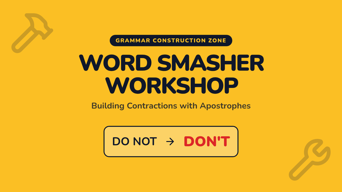 A 2nd-grade grammar lesson where students become 'Word Smashers,' learning how to use apostrophes to combine words into contractions through video analysis and interactive whiteboard practice.