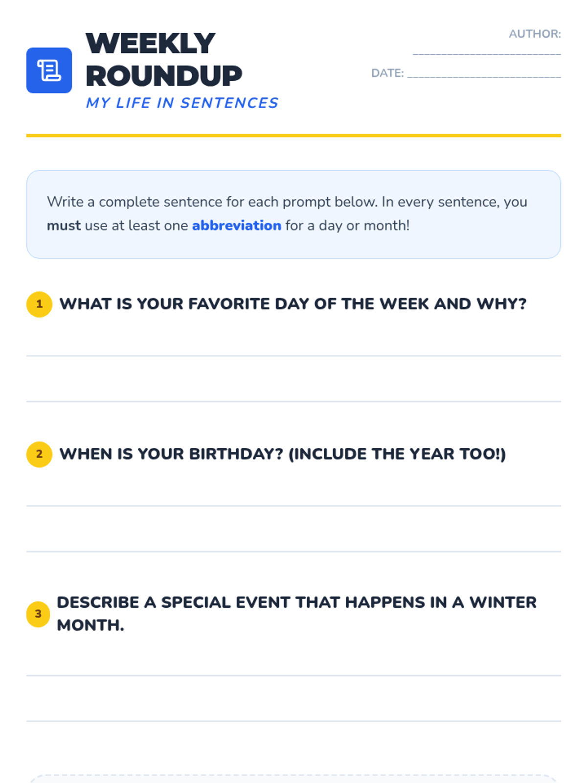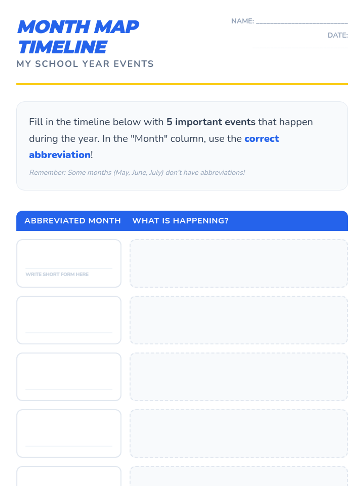 Students apply their skills by filling in a blank monthly calendar with school events, holidays, and birthdays. They must use the correct abbreviation for the day and month in the header and date boxes.