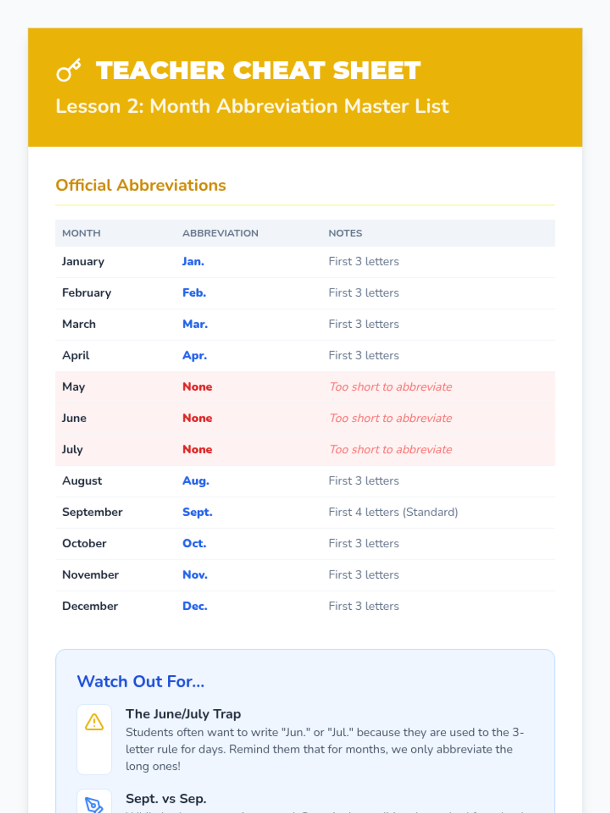 Students categorize months into those that have common abbreviations (Jan., Feb.) and those that typically do not (May, June, July). They create a timeline of their year using these short forms.