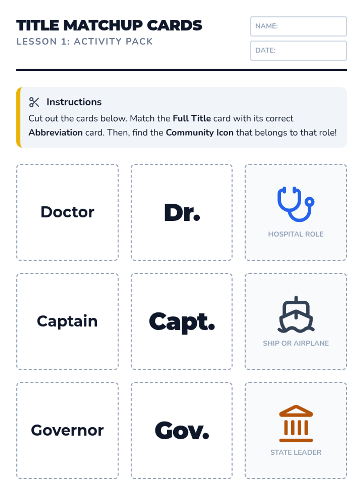 Students brainstorm community helpers and learn the specific titles associated with them, matching full titles to their abbreviations.