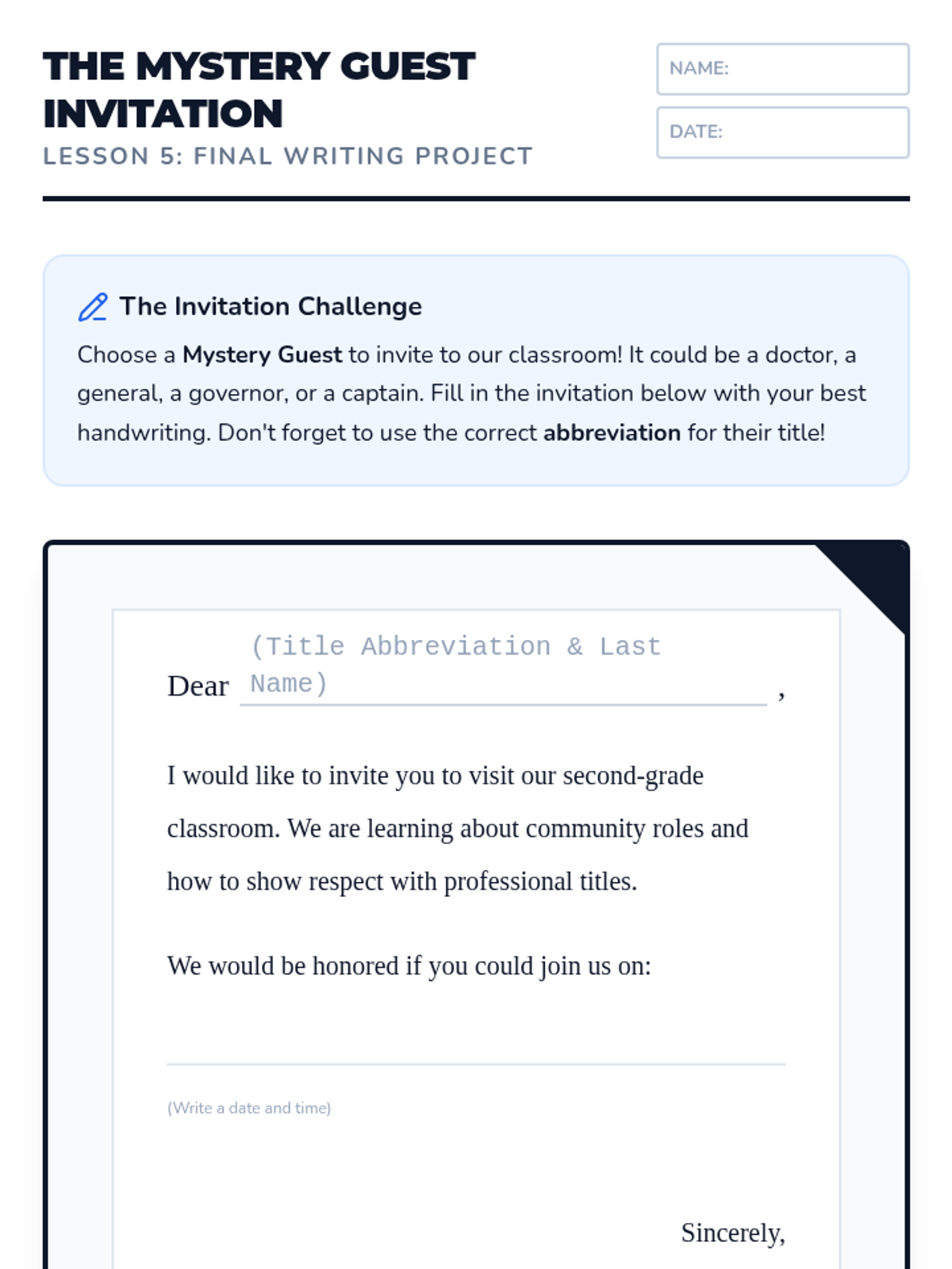 Students draft a formal letter to a real or fictional person of authority (e.g., the school Principal or a local Mayor). They must correctly use the recipient's title in the inside address and salutation.