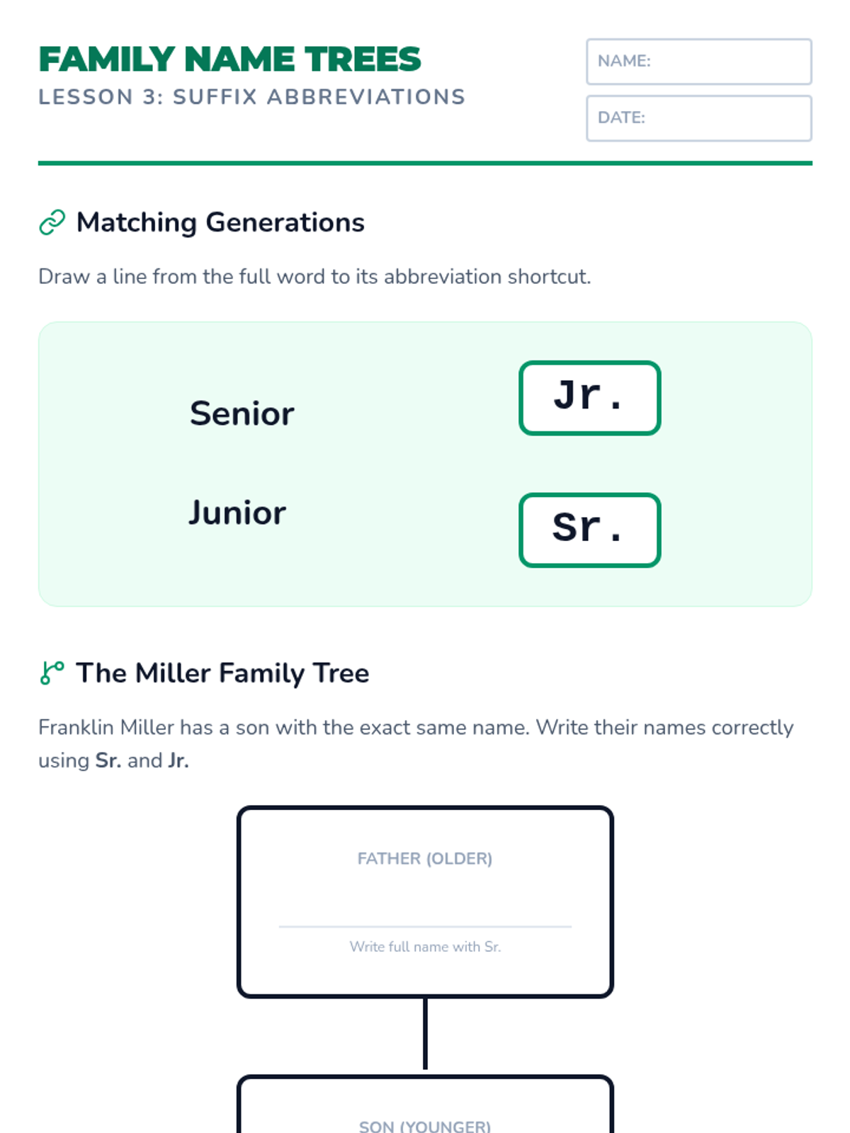 Exploring generational abbreviations Sr. and Jr. to understand lineage and name suffixes.