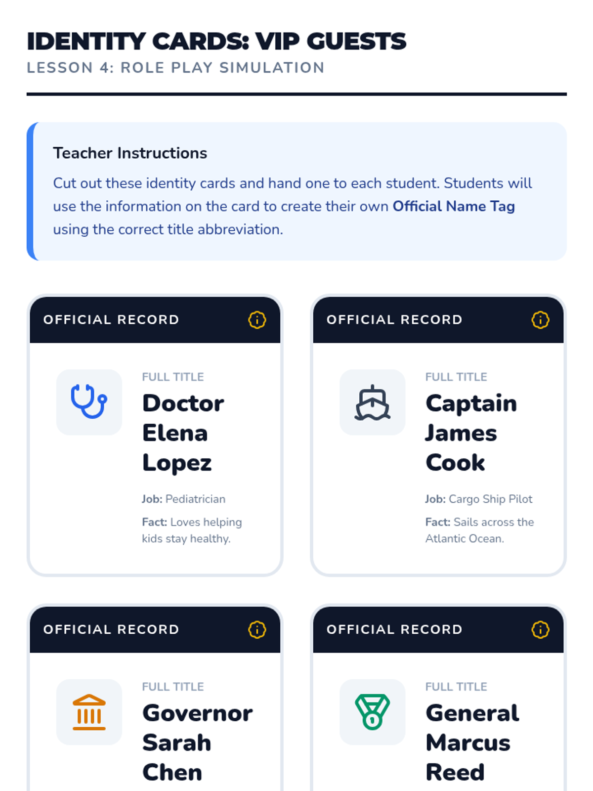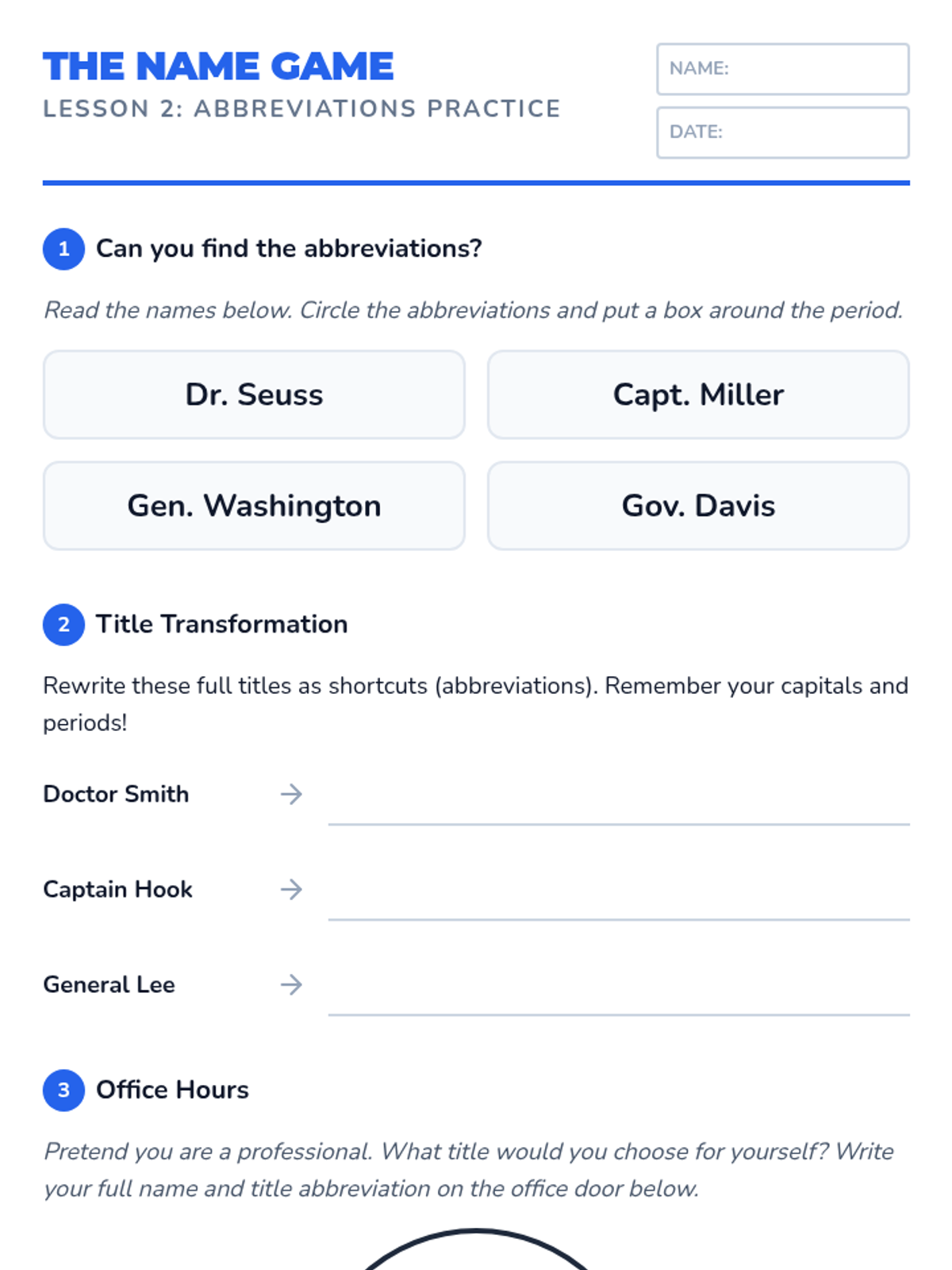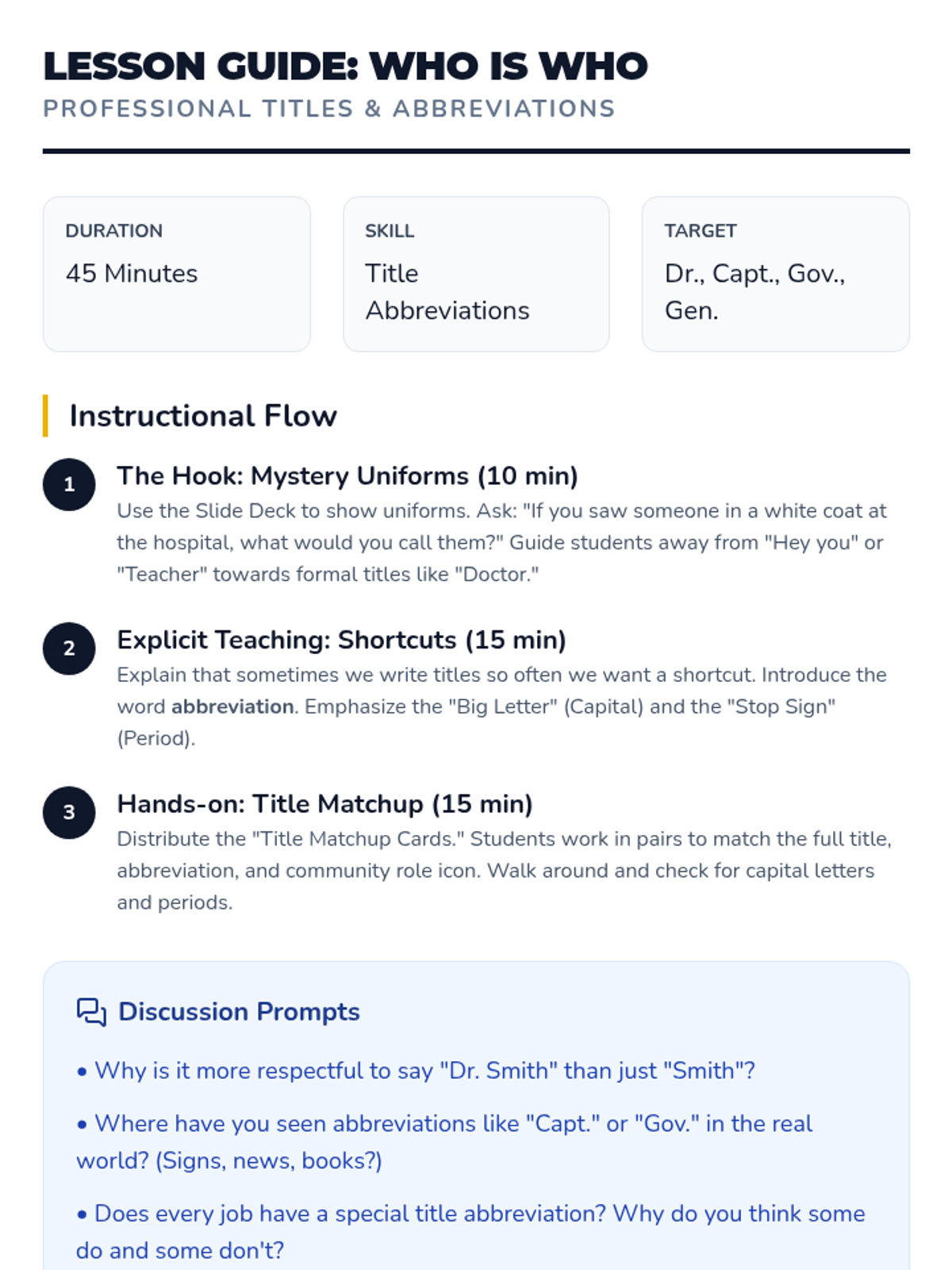 Students explore titles used in civics and history, such as Pres., Gov., Sen., Gen., and Capt. They read short biographical blurbs and identify these abbreviations, discussing why titles are often shortened in news and history books.