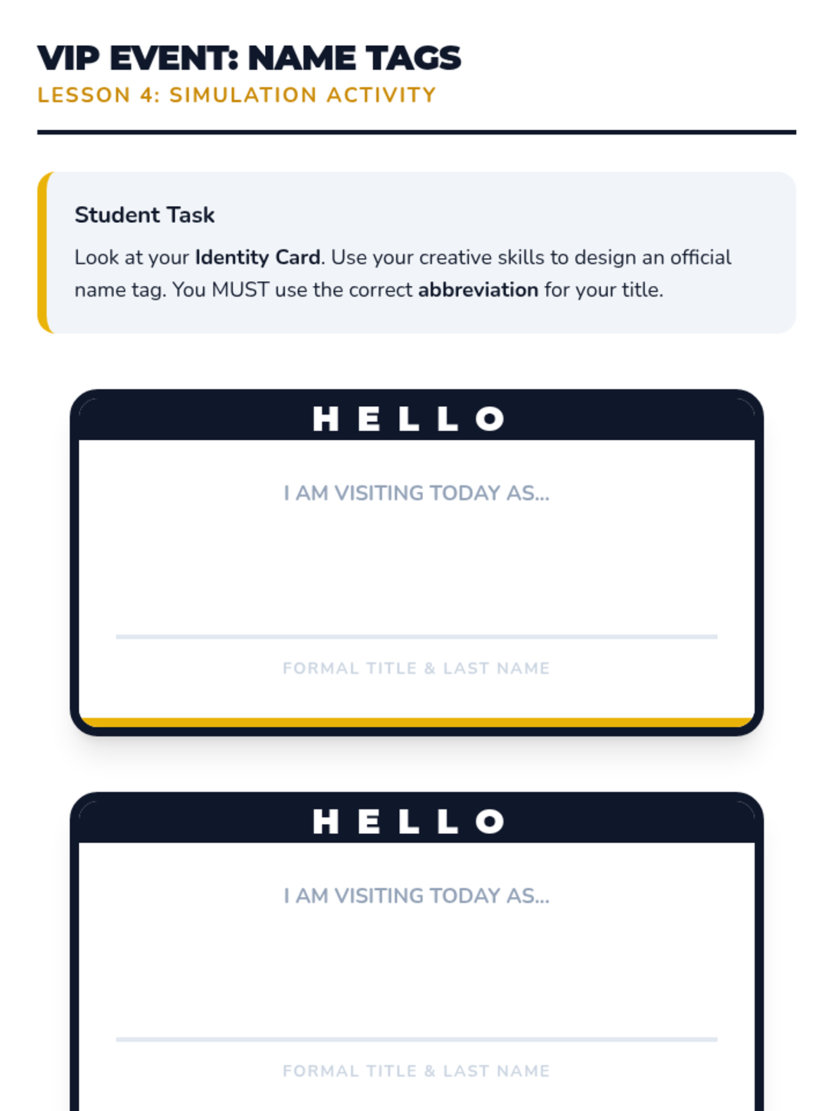 Students apply their skills to draft formal invitations using correct title abbreviations in salutations.