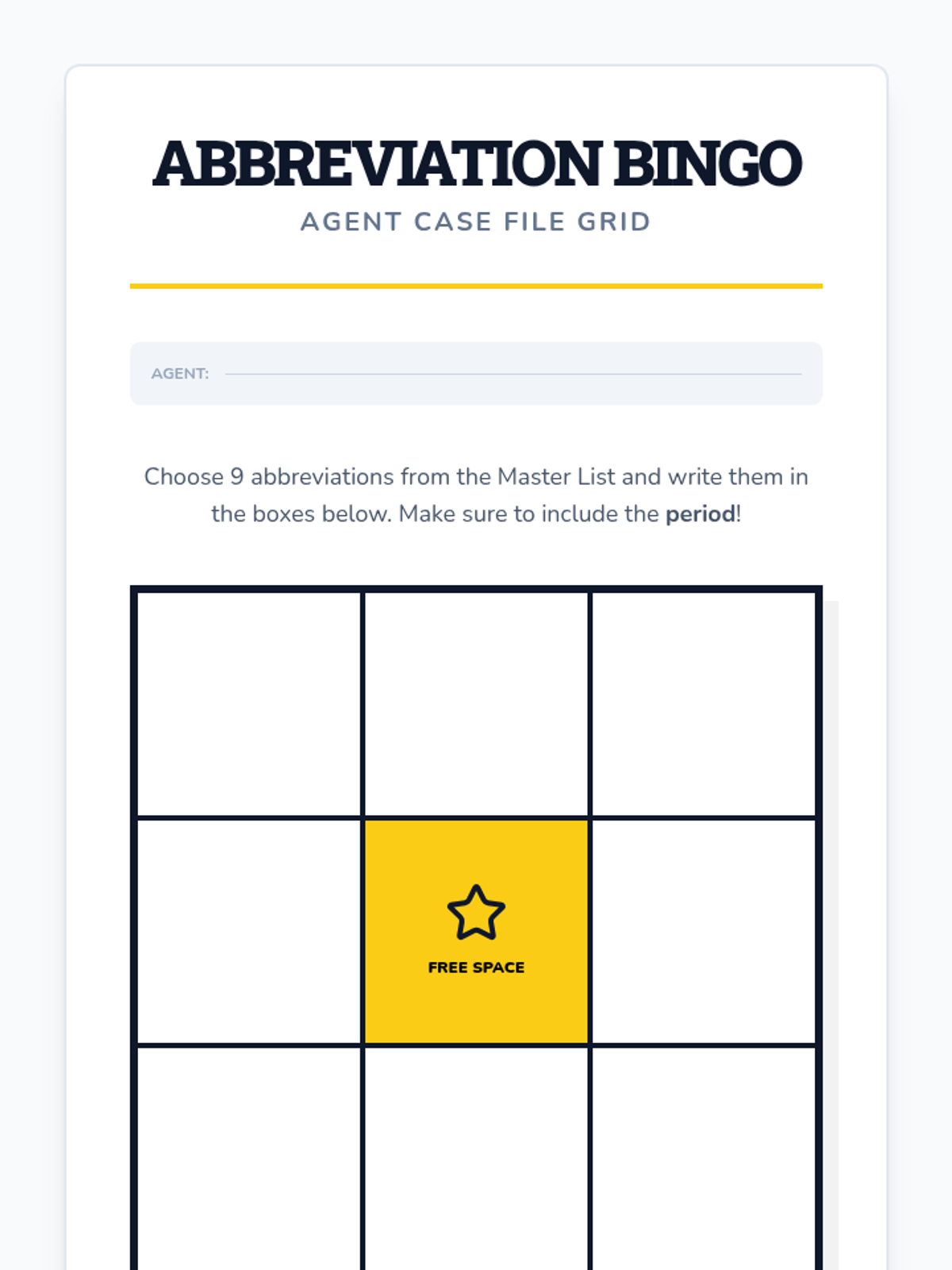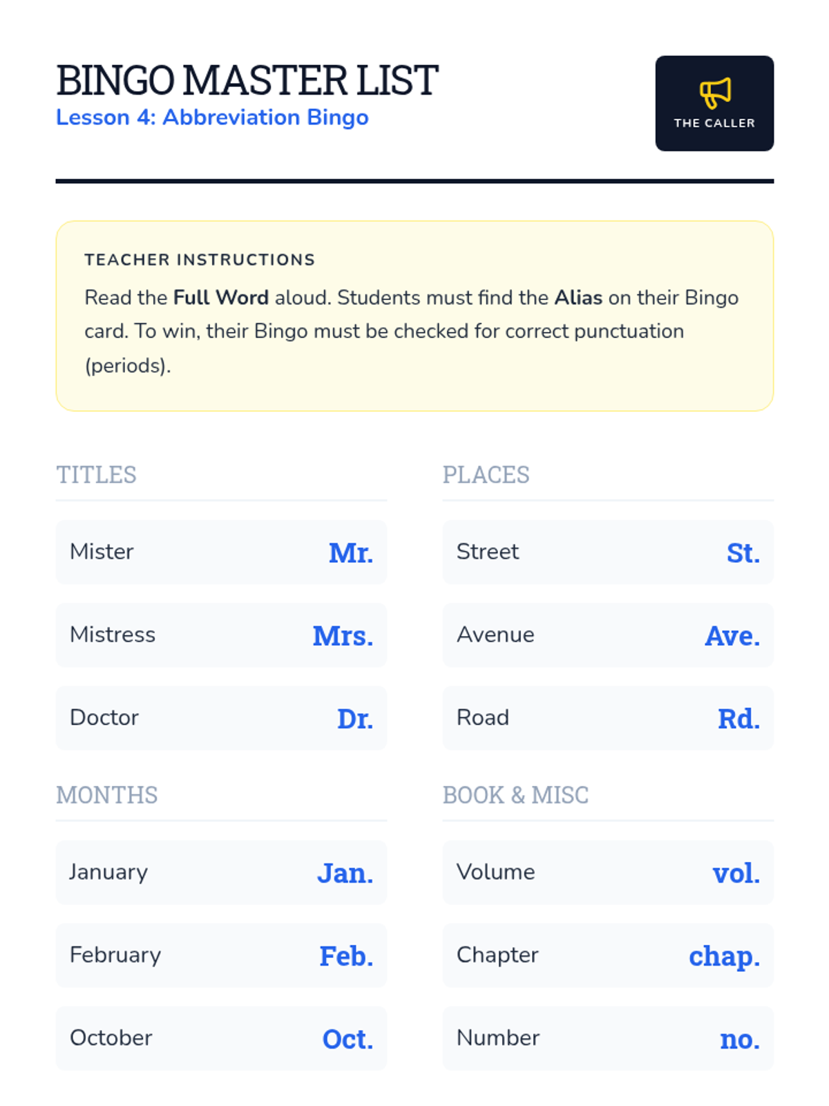 A high-energy review game where students practice rapid recall and correct spelling of common abbreviations with their necessary punctuation.